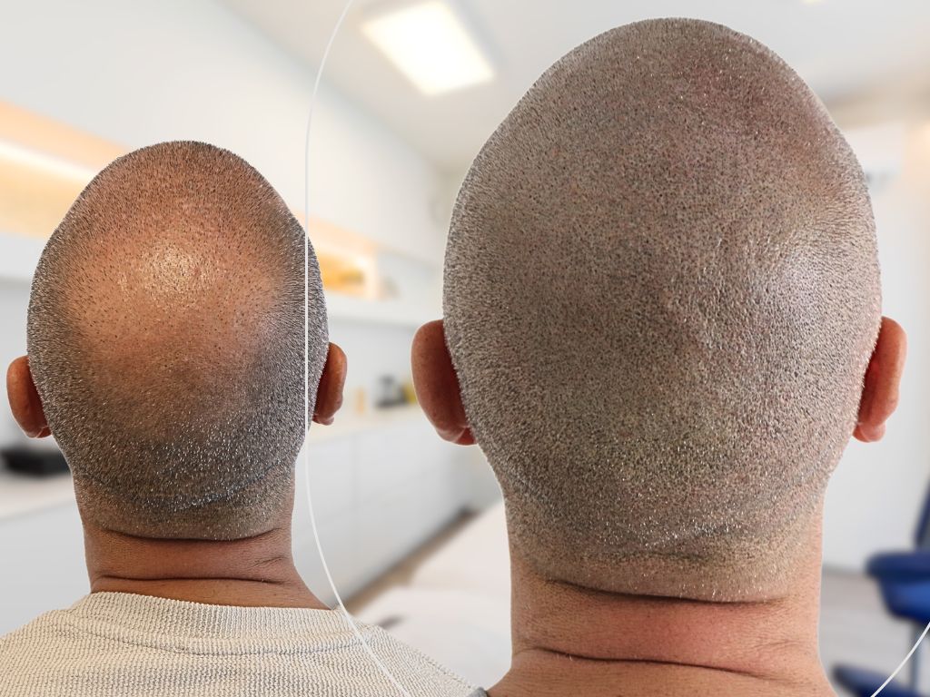 Die Lösung: Haarpigmentierung! Mit dieser Technik konnten wir die Illusion von Haarstoppeln im kahlen Bereich erzeugen, wodurch eine gleichmäßige und einheitliche Dichte entstand.