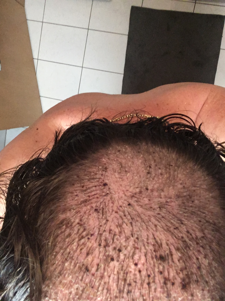 Sorry aber dieses Bild mit mit ein paar Krusten lässt leider keinen Rückschluss auf die gesetzte Dichte zu. Ich kann auch nur sagen dass die gestzten Grafts genauso gewachsen sind wie vorn. Dass man das Ergebnis in der Tonsur erst etwas später sieht liegt ehr daran dass dort aufgrund der geringeren Dichte eine optische Dichte erst mit etwas längeren Haaren erreicht wird und bei doubles und triples nicht alle Haare gleich rauskommen sondern Zeit versetzt, aber anwachsen tun sie genauso wie vorn.