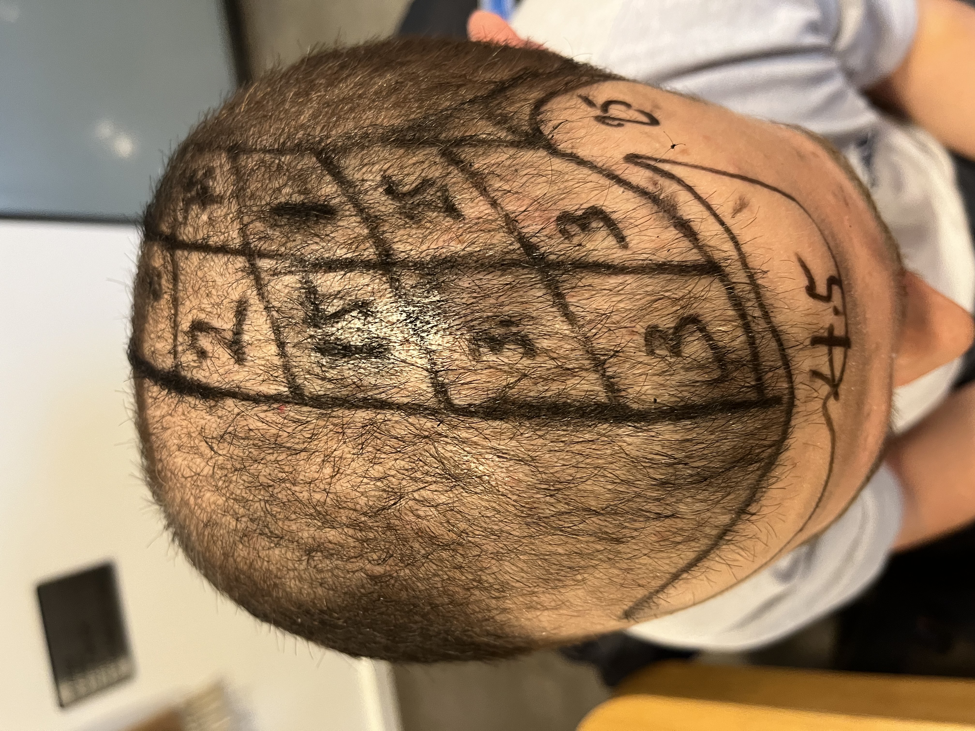 So hat es nach 5 Wochen ausgesehen. Ich hatte interessanterweise nicht viel Shock loss. Ich denke mal so 40-50% der transplantierten Haare