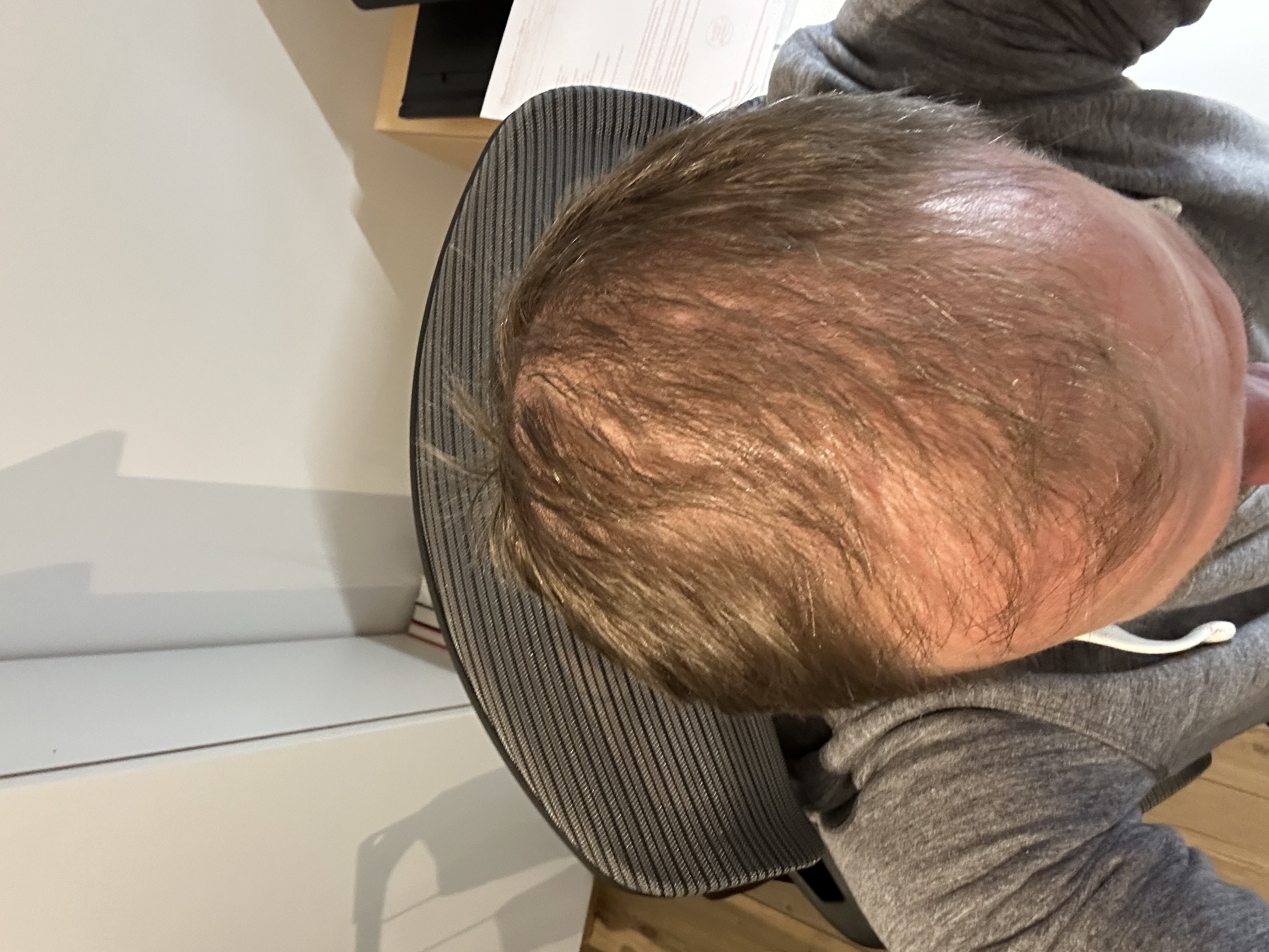 * Aktueller Haarstatus nach der Hamilton-Norwood-Skala: siehe Foto, tue mich schwer mit einer Einschätzung - ich habe recht dünnes Haar auf dem Oberkopf