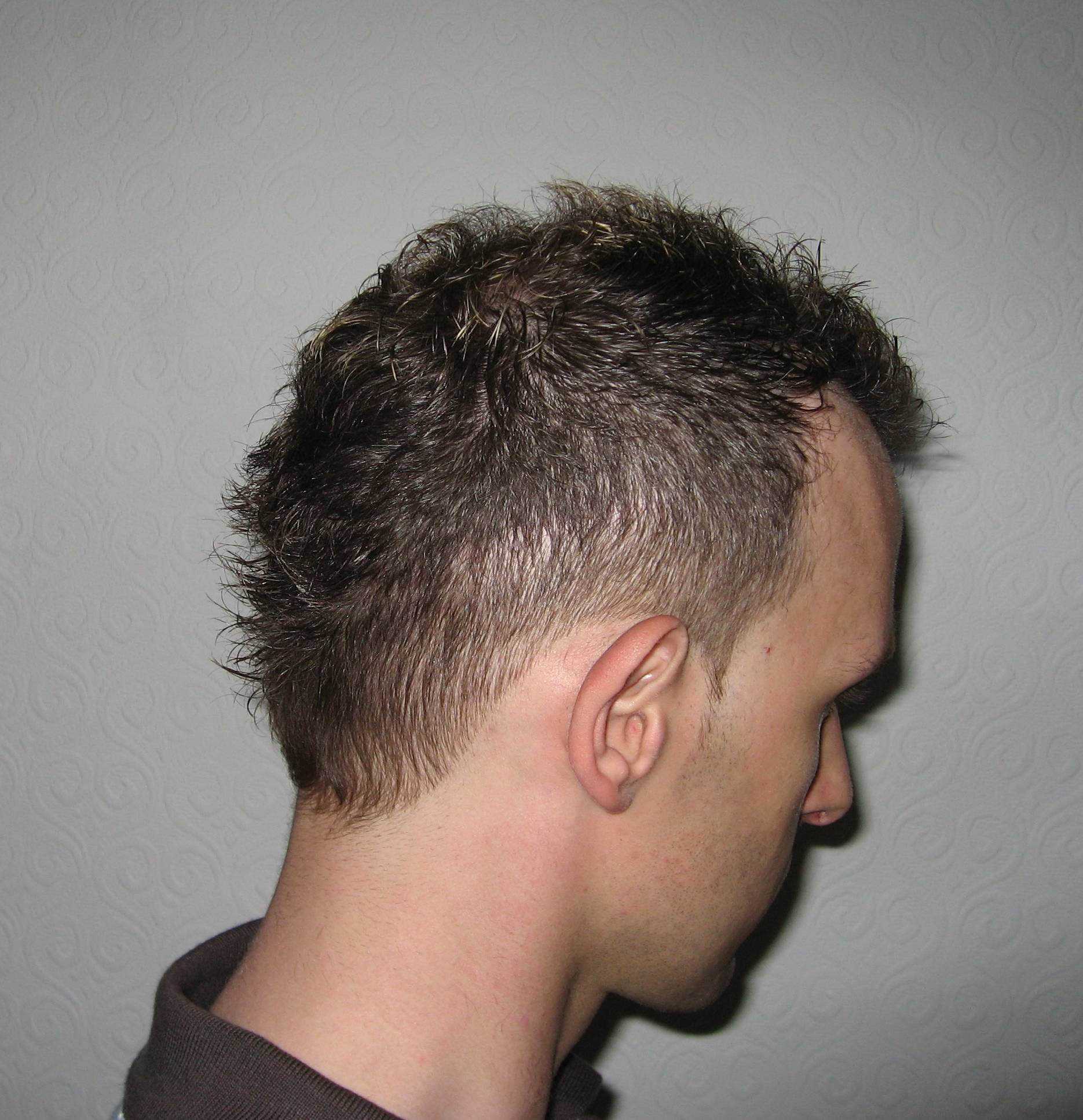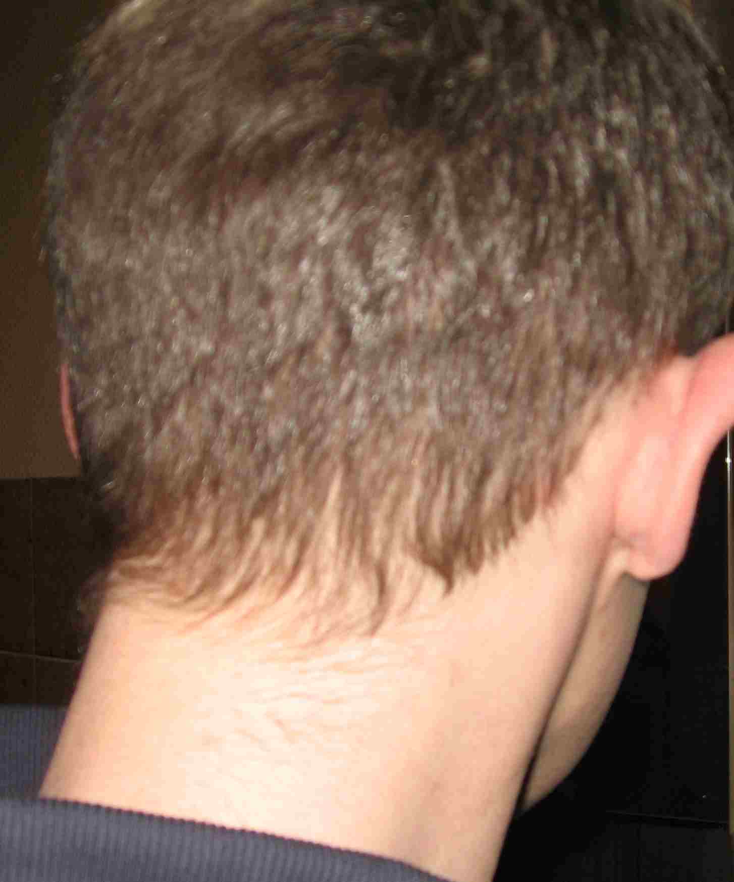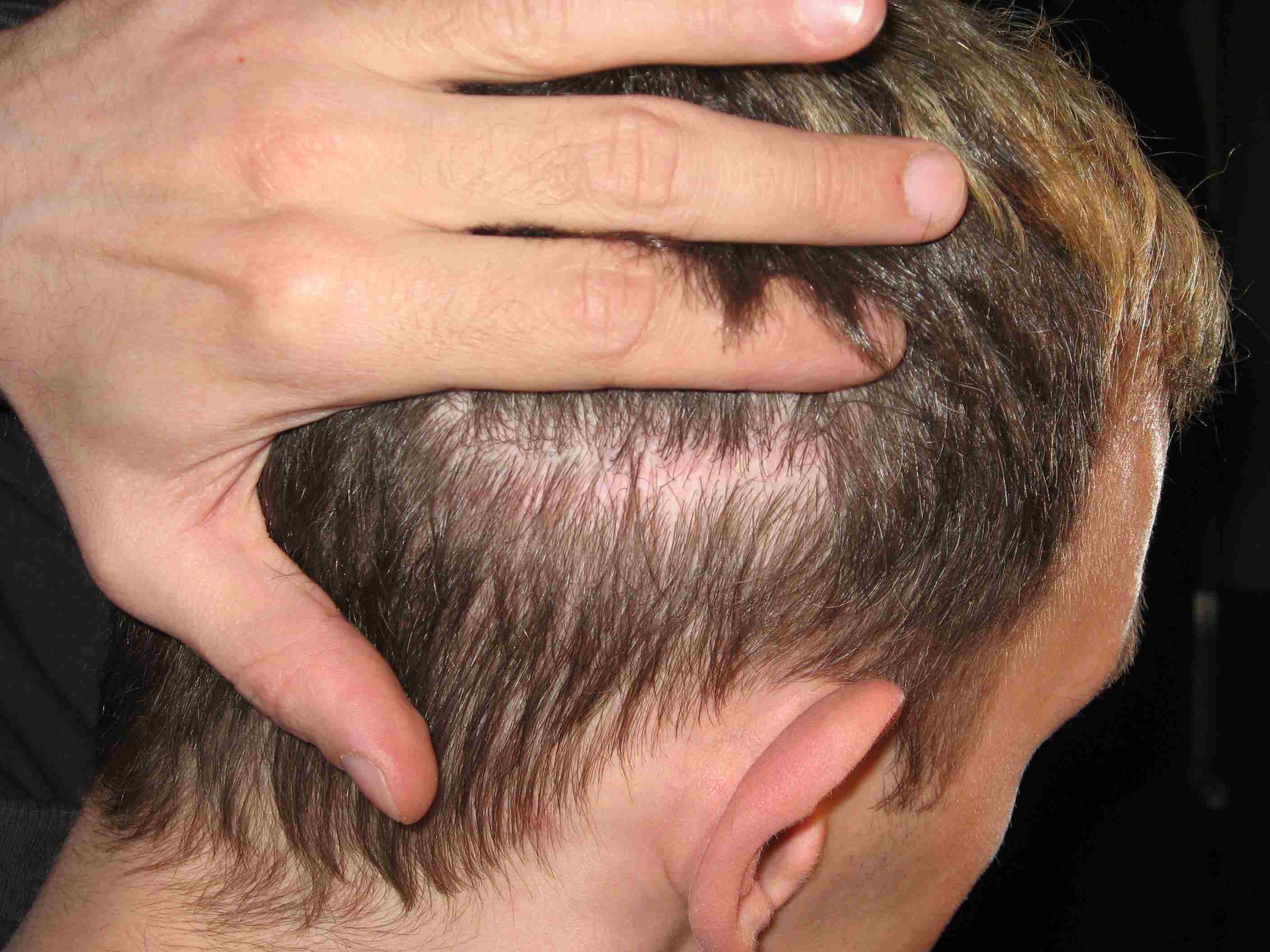 Der letzte Friseurbesuch war vor ca. 2-3 Wochen. Ich hab hinten und an den Seiten auf 12 mm schneiden lassen, da konnte ich sehen wo die Narbe verläuft, aber die Friseurin meinte, sie sieht nichts. Erst als ich ihr genau mit dem Finger gezeigt habe wo, meinte sie, dass man es ganz schwach sieht, aber man es eher für einen Haarwirbel oder so halten würde.
