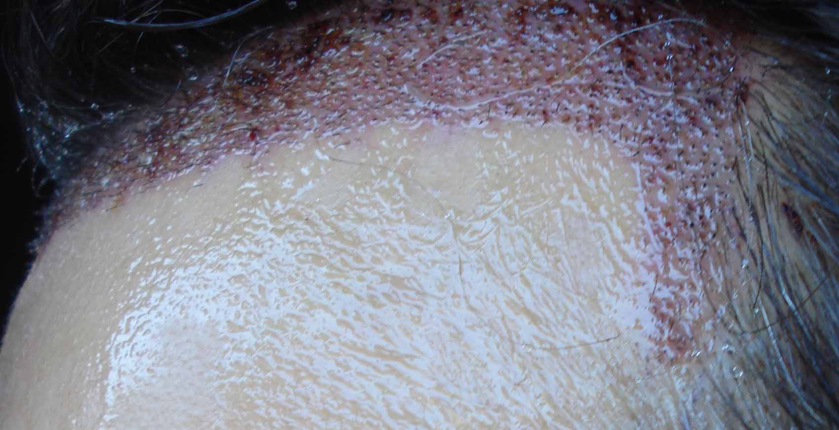 Bei dieser OP wurden aufgrund der höheren Dichte viel mehr Hautverletzungen produziert als bei OP 1 - d.h. es ist potentiell mehr "Angriffsfläche" für das Propylenglykol (der Stoff in Regaine, der hauptsächlich die Hautreizungen verursacht)da.