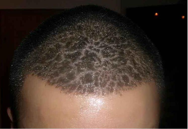 Ich gehe zurück zu meinen Mikroskop um der Rest von den grossen Streifen zu präparieren und die perfekt intakte FU's (ich glaube es werden um die 3300, inklusive Family Folliculars, und viele 3er) reinzusetzen. Patient wird in 12 Monate ein tolle Frisur haben, und eine lange dünne Narbe die von Ohr zu Ohr geht aber die aber schon jetzt komplett von seine 1 cm Haare abgedeckt ist (obwohl er jetzt Klammen drin hat, sieht man nix davon). Er will Haare haben, nicht Haare abrasieren, das könnte er auch ohne HT machen.