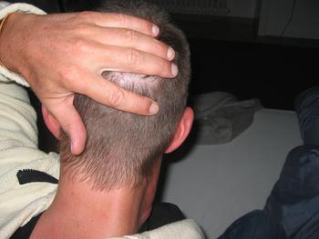 Auf dem Bild sieht man den Donor von Scherzkeks Vito direkt nach Aberntung von 1950 FUES. Vorgängig hatte er schon 1500 FUES, zu sehen an den weissen Punkten, sprich Narben. Schaut euch das Bild in der Vergrösserung an und ihr seht sehr schön was da schon fehlt nach rund 3500 FUES. Gewisse Areale weisen jetzt schon richtig kahle Löcher auf. Nehmen wir jetzt nochmals 1500 raus (macht dann 5000..) UND HABEN DANN DEN VIELGEPRIESENEN, NARBENFREIEN:-) und kaum AUSGEDUENNTEN Donor eines wieder glücklichen NW6-FUE-Patienten.