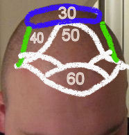 Also ich habe mir folgendes überlegt: Vorne will ich eine 60er Dichte, im Gebiet dahinter würden mir 50 gefallen. Die Seiten 40 und die Tonsur könnte evtl. frei oder um die 30 werden.