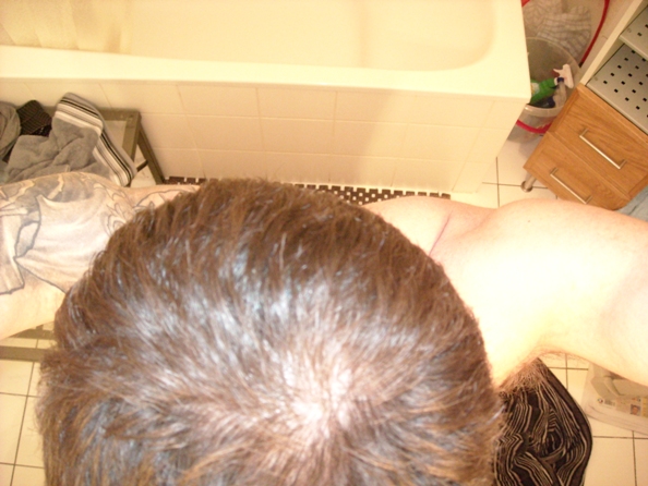 so das wars. ich bin gerade total depri, da ich mir meine haare eigentlich noch nie unter so extremen lidhtverhältnissen und nach hinten frisiert angesehen habe. aber was soll ich hier bescheißen, so siehts nun mal aus. die tonsur ist auch schlechter als ich gedacht hatte.
