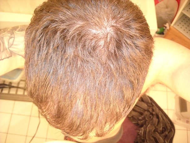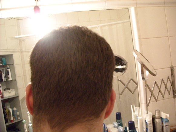 so das wars. ich bin gerade total depri, da ich mir meine haare eigentlich noch nie unter so extremen lidhtverhältnissen und nach hinten frisiert angesehen habe. aber was soll ich hier bescheißen, so siehts nun mal aus. die tonsur ist auch schlechter als ich gedacht hatte.