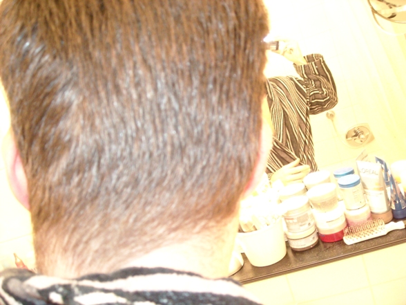 so das wars. ich bin gerade total depri, da ich mir meine haare eigentlich noch nie unter so extremen lidhtverhältnissen und nach hinten frisiert angesehen habe. aber was soll ich hier bescheißen, so siehts nun mal aus. die tonsur ist auch schlechter als ich gedacht hatte.