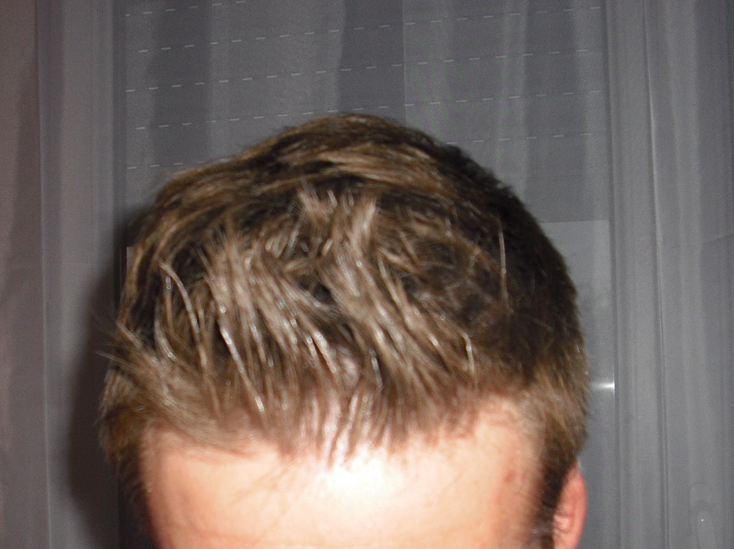 PS: Hast du da Gel in den Haaren? Mach doch mal ein Bild mit frisch gewaschenen, trockenen Haaren und etwas mehr Schärfe. So sieht man wenig.