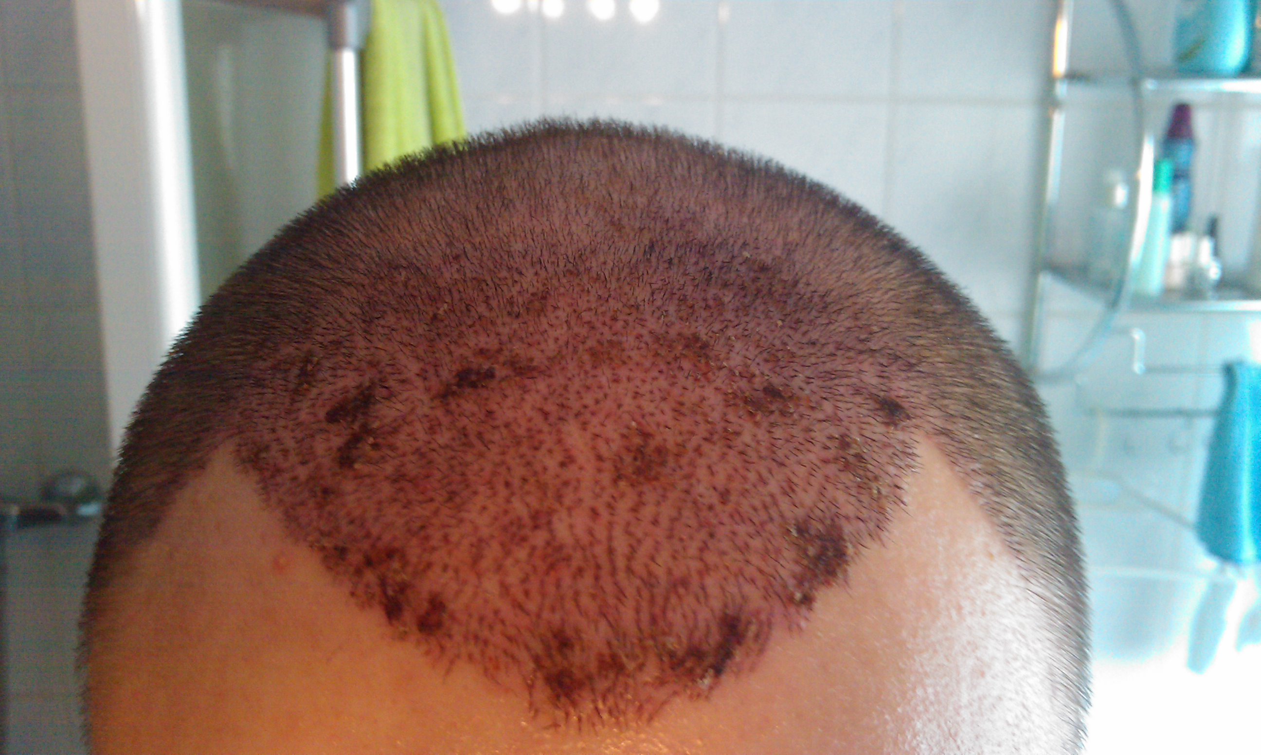 Zurück zu mir: Habe mal ein Foto meiner Donor eingefügt. Ist leider nicht das schärfste, habe zur Zeit nur meine Handycam. Was haltet ihr von der Wundheilung (TAG 3)? Hinten habe ich kaum noch Krusten, seitlich ein Paar.