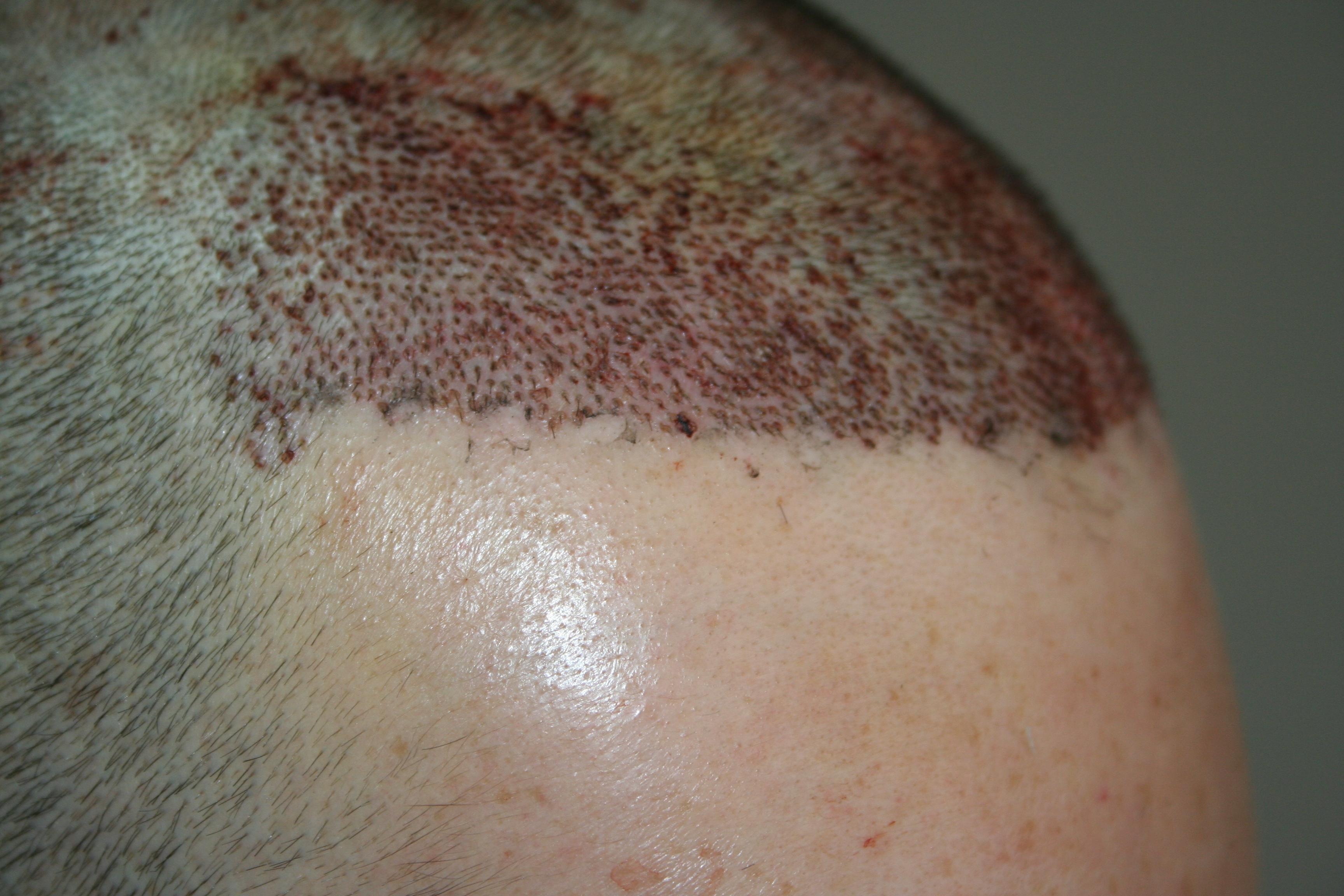 Es sind viele Haare ausgefallen die meisten so 10-12 Tage post OP, fast alle die ausgefallen sind waren mit Krusten habe sie nur leicht mit den Fingerspitzen berührt und sie sind ausgefallen. Denke 50 bis 60 % aller Haare, jedoch ohne Blut und Schmerz, der Rest ist bis heute so geblieben. Habe keinen wirklichen Neuwuchs registriert vll paar Stoppeln, könnt aber auch Einbildung sein:).