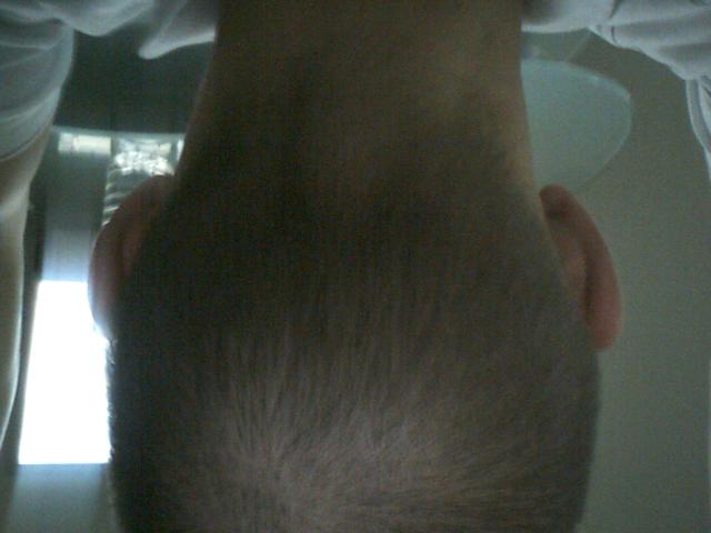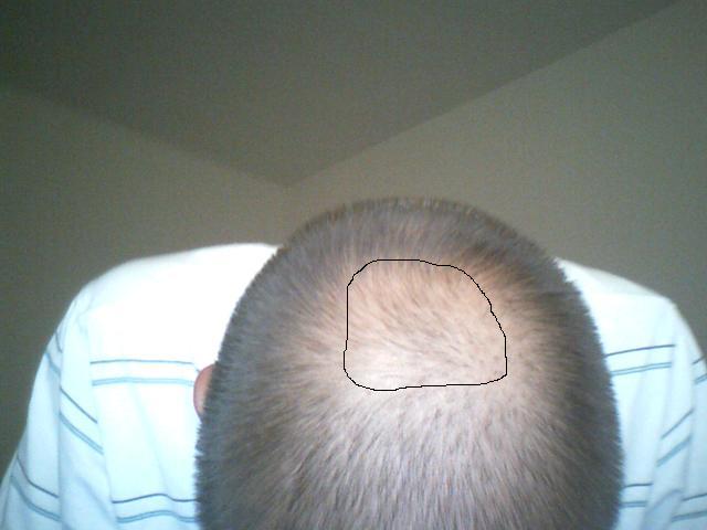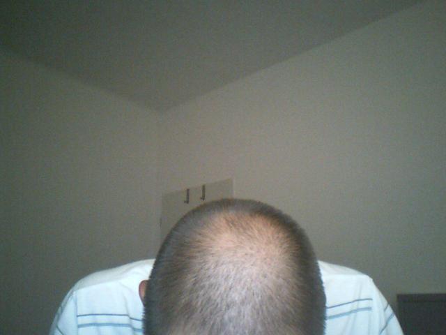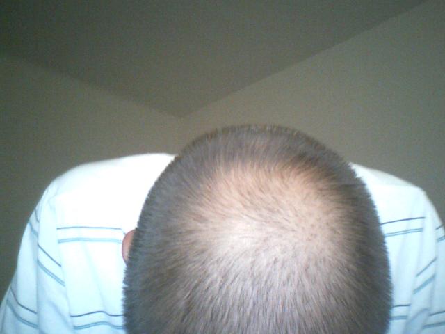 Mich stört vorrangig die Tonsur, es mag vielleicht komishc klingen, aber so drastisch, wie es auf diesen Nahaufnahmen aussieht, kommt es mir persönlich noch nicht vor. Wenn ich mich aus 2 Metern Entfernung im spiegel betrachte, sieht man, eine , im Vergleich zu manchen hier gesehnen "Fällen", eine relativ kleine kahle, runde Fläche, in deren Mitte sich noch Resthaar befindet. (siehe z.B. Bild Cool.
