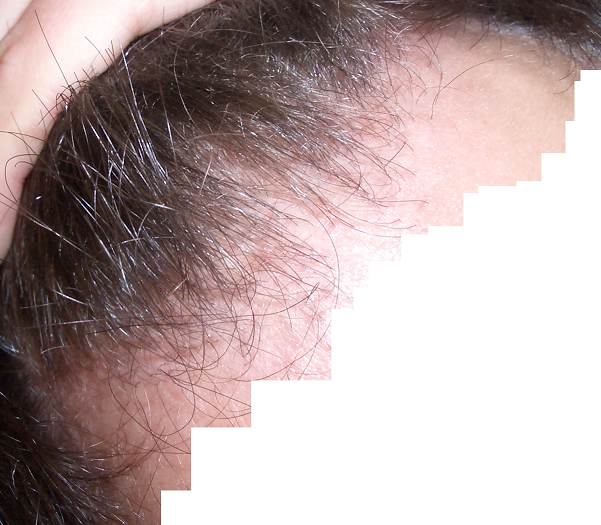 Zu meinem jetzigen status kann ich sagen, das ich an der Front noch haare habe, jedoch wird diese immer lichter und der haaransatz geht immer weiter zurück. Gerade wenn ich unter hellem licht stehe, schimmert die kopfhaut an der front zum teil durch.