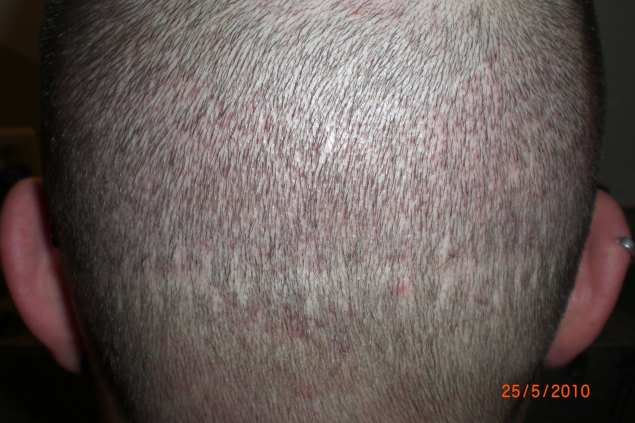 werde die narbe erst dann behandeln lassen, wenn alle anderen "baustellen" abgeschlossen sind. wie gesagt, ich werde die haare nie so kurz tragen wie momentan. anbei 2 bilder von heute, genau eine woche post-op. bin seit dem 4.tag krustenfrei. beschleunigt hat dies das sog. vit-spray, welches ich von dr. feriduni nach der op bekommen habe (tippe auf kochsalzlösung). habe dieses spray jede halbe stunde aufgetragen. der donor juckt ziemlich stark, was ja aber als zeichen der heilung gilt.