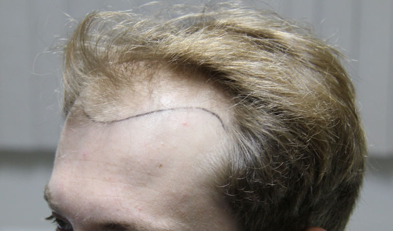 Am ersten Tag wurde die Haarlinie mit 1500 Grafts rekonstruiert. Am zweiten Tag das Gebiet dahinter mit 1600 Grafts bearbeitet. Es wurde auf eine Fläche von ca. 67 cm² transplantiert.