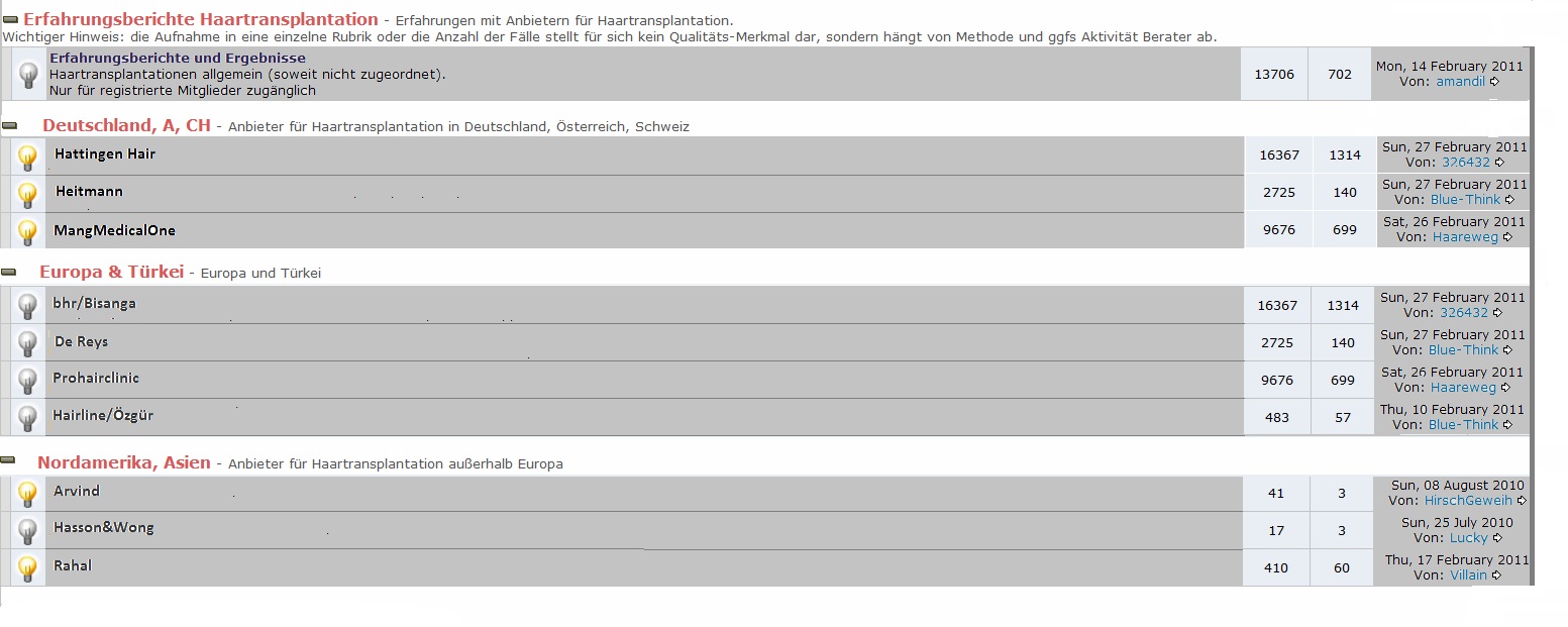 * Diskussionen über Anbieter im Allgemeinen (auch Beispiel-Ergebnisse anderer Patienten) -> "Anbieter Haartransplantation"