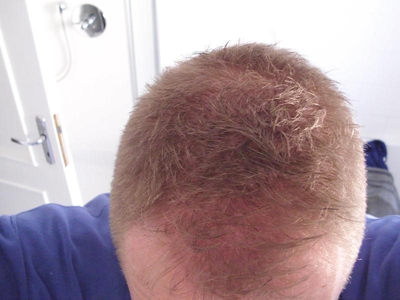 Die Fotos habe ich bei Sonnenlicht gemacht. Mit nassen Haaren und Blitzlich sähe das ganze noch schlimmer aus, mit etwas länger und anders gegelten Haaren etwas weniger schlimm.
