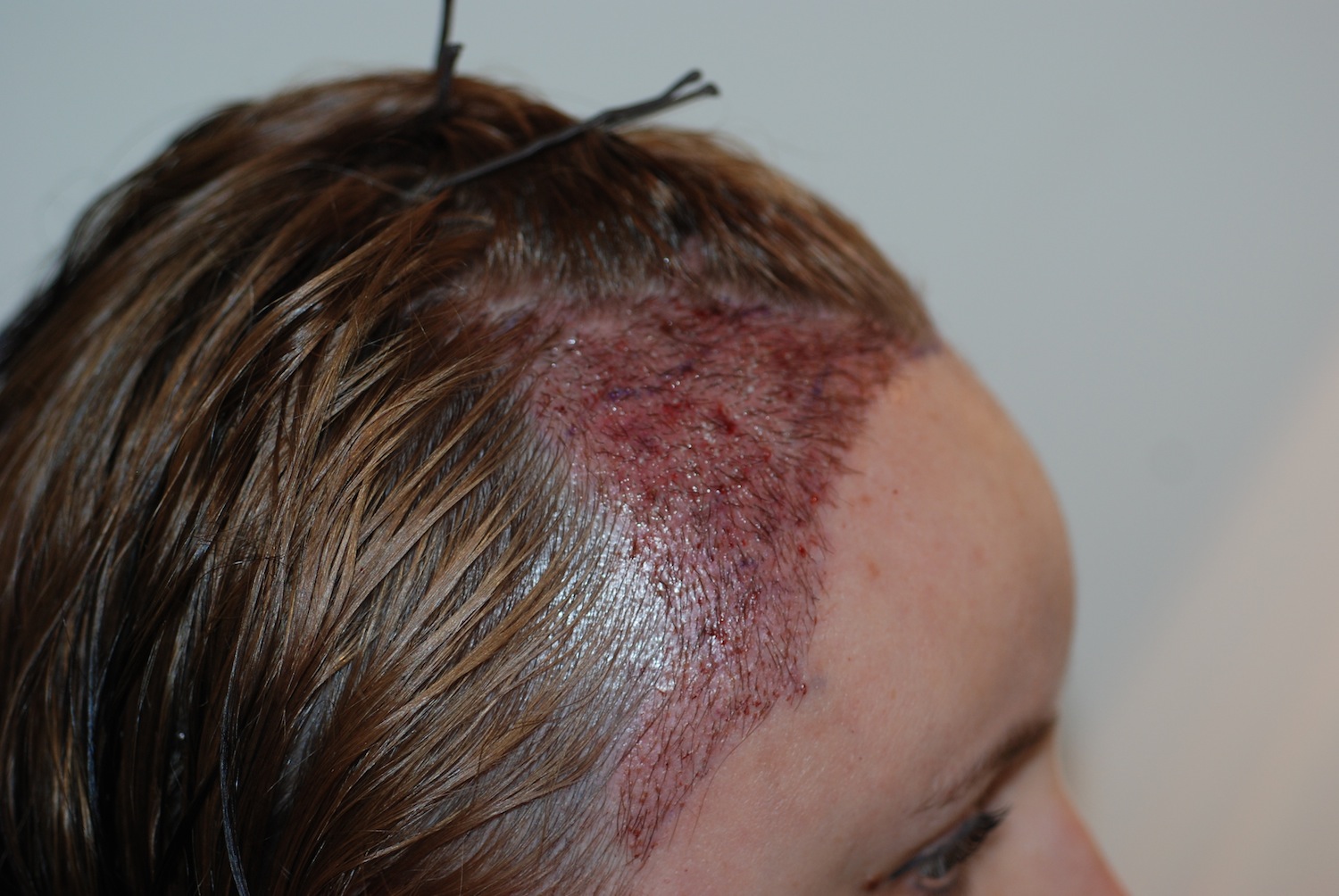 DIe Narbe wurde so genäht, das die Haare wieder durch die Narbe durchwachsen. Und da das Narbenbild alt ist gehe ich davon aus, dass noch nicht alles Haare wieder nachgewachsen sind.
