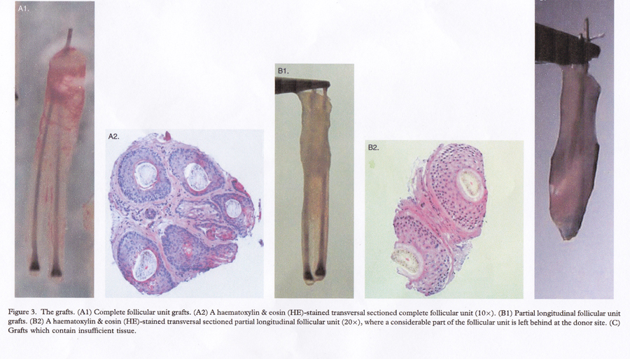 Dr. Gho hat in seiner oben genannten Publikation mit Sicherheit, wie in seinem Paper erwähnt, eine 0.6 mm Hohlnadel verwendet. Mit einer Hohlnadelgröße von 0.6 mm werden die Talgdrüsen "skalpiert". Wenn wir die folgende Abbildung aus der Publikation anschauen, werden wir die fehlenden Talgdrüsen an den Grafts feststellen. Wir dürfen diese Entfernung der Talgdrüsen durch eine Hohlnadel von 0.6 mm nicht unterschätzen, weil in den Talgdrüsen ebenfalls die so wichtigen Stammzellen für die Regeneration der Haarfollikel sitzen.
