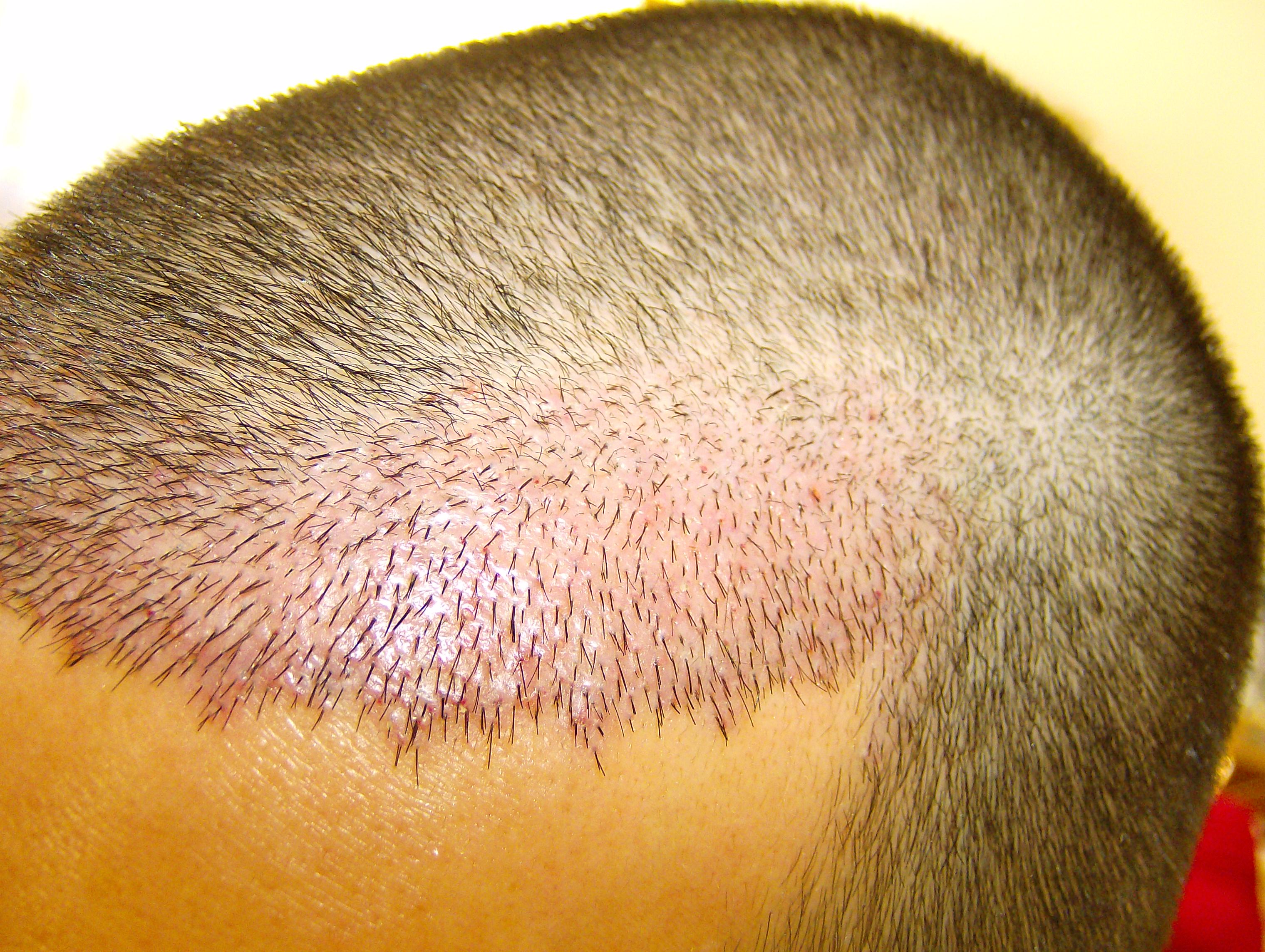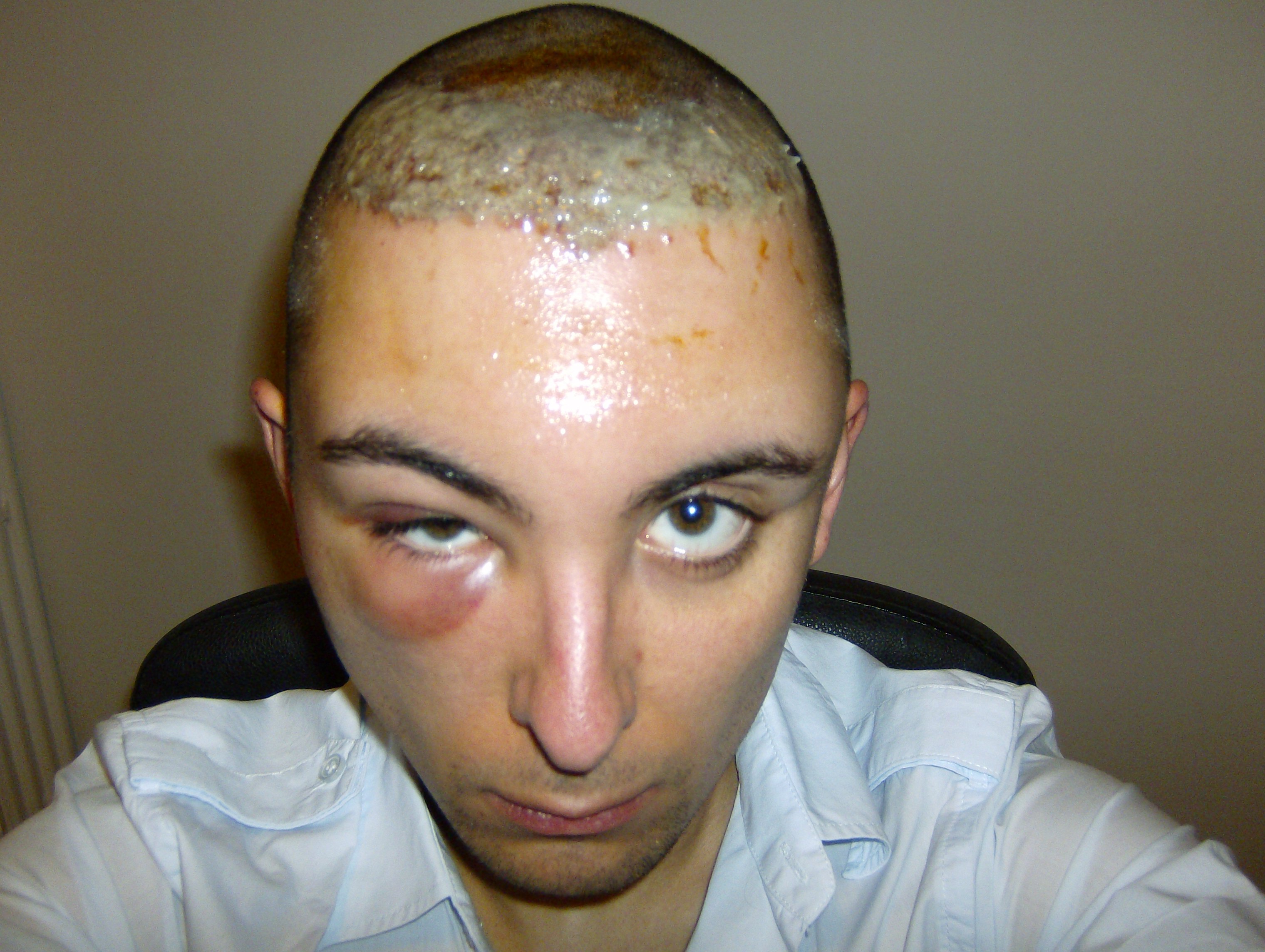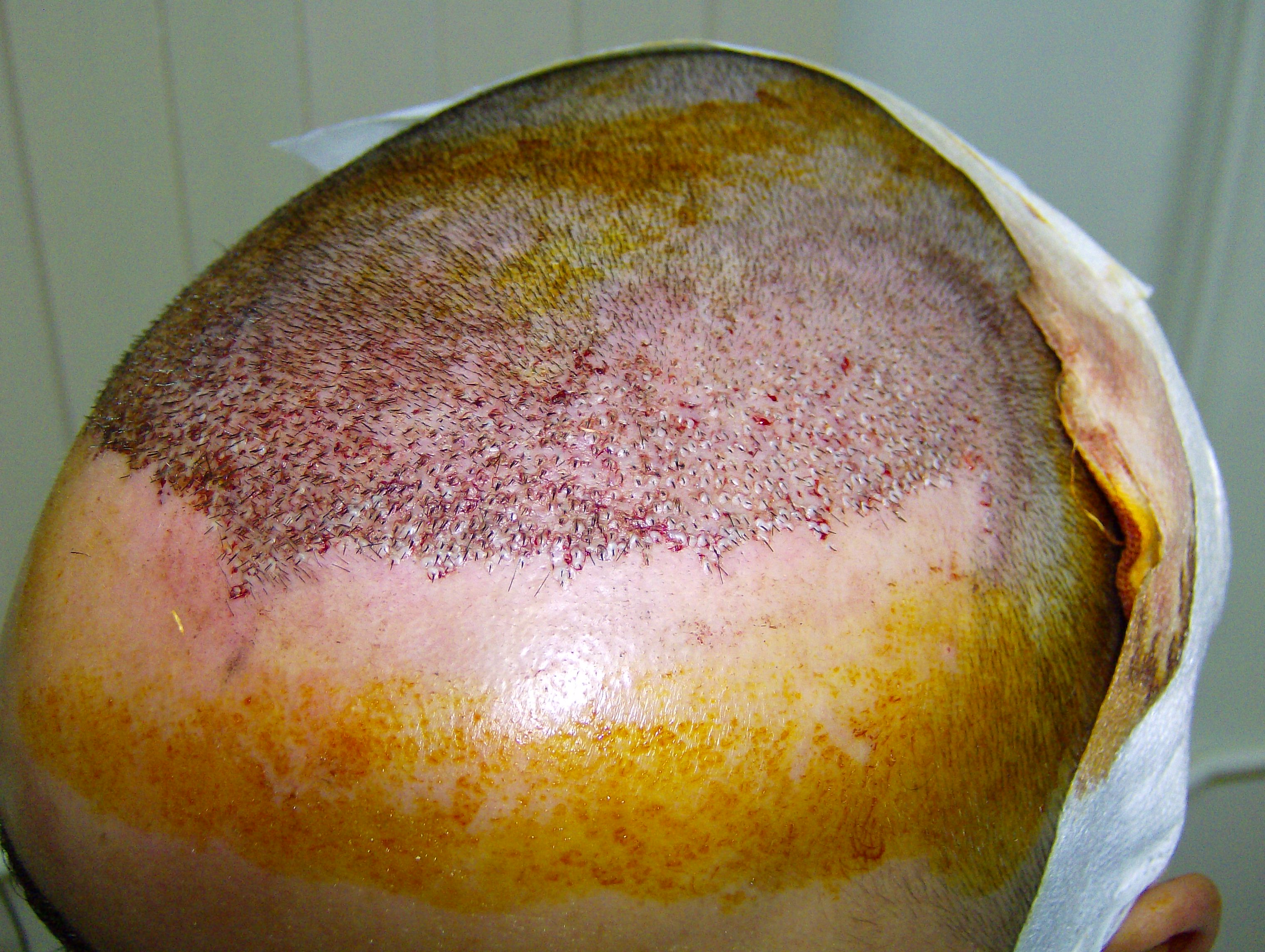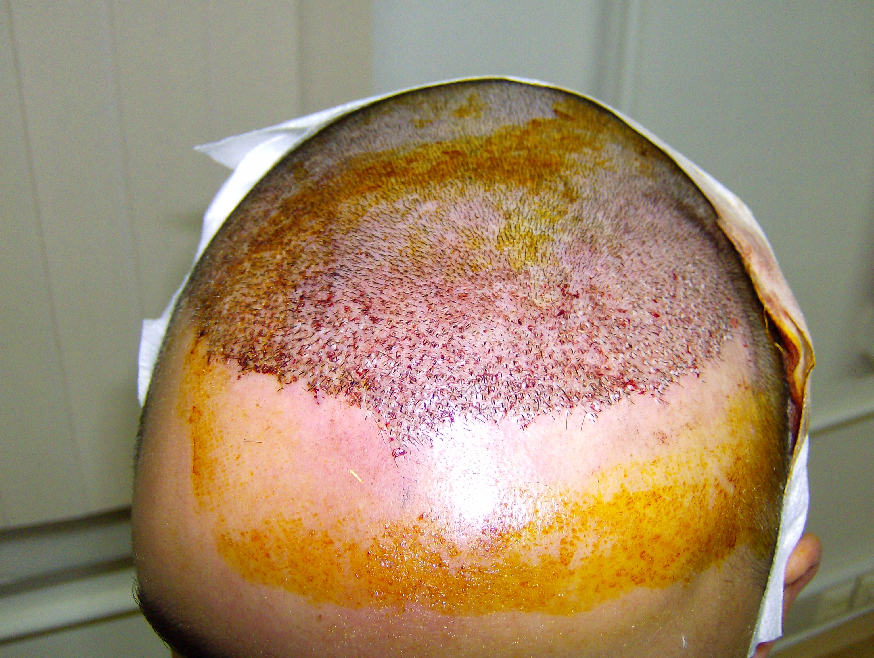 Die Bilder sind exakt 7 Tage post Op, und die Krusten waren bereits ab, aber es gab auch nicht wirklich Krusten, es war nur die abgestorbene Haut von den implantierten Haarstoppeln und etwas Blut stellenweise. Was für mich allerdings neu/unerwartet war, ist, das nach ca. 10 Tagen sich erneut Krusten bildeten, diesmal ist die gesamte Fläche wo die Haut gerötet war "abgestorben", d.h. die oberste Hautschicht ist ausgetrocknet und hat sich in Form von Riesenschuppen gelöst, oft mitsamt der nun leider ausfallenden Haare. Habe momentan von meinem subjektivem Gefühl her ca. 30% der implantierten Haare bereits verloren und es kommen ziemlich viele dicke eitrige Pickel hervor. Aber der Verlust ist ja nur vorübergehend und ich hoffe dass die Haare ganz schnell wiederkommen . Ach ja, und die Haut die unter den "Schuppen" zum Vorschein kam ist zwar noch gerötet, aber nicht mehr so stark wie davor. Am 02.09 werde ich die 1-Monats-Bilder machen, also abwarten!