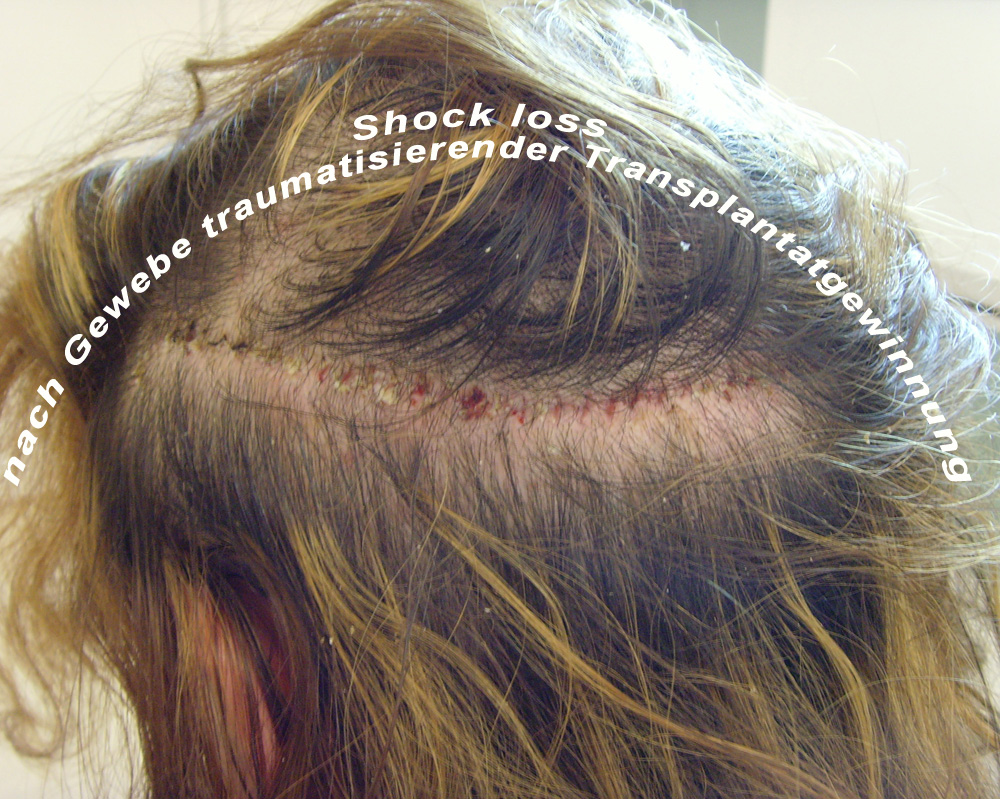 2) Traumatisch bedingte Ausdünnung in der Spenderregion, welche durch den irreversiblen Ausfall der Haare im Sinne von Shock loss verursacht wird