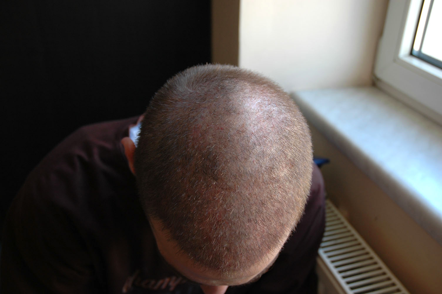 Ein Großteil der BHT grafts fallen übrigens nicht aus und wachsen direkt weiter. Dazu eine gerötete Kopfhaut und Aufnahme im Schatten.