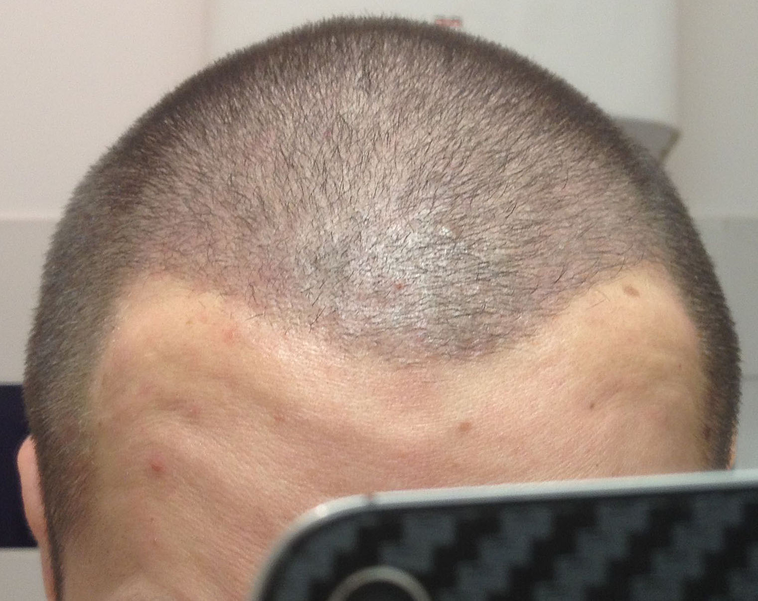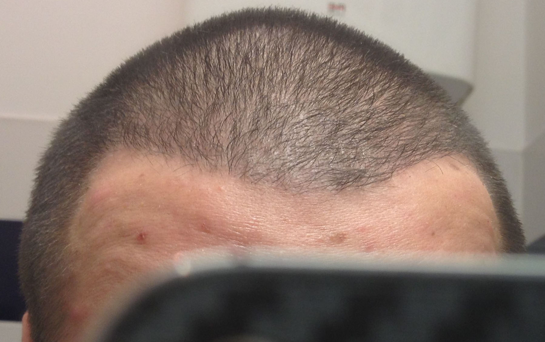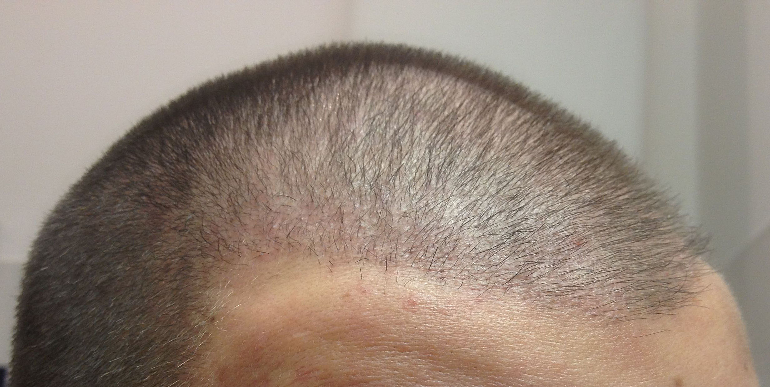 Die Haarlinie ist von mir, Dr. Keser hat mir zuerst eine vollkommen gerade Haarlinie gezogen, ich habe sie dann rund 1-1,5 cm an den Geheimratsecken nach oben versetzt. Die Grafts, die ich da gespart habe, will ich lieber später mal verwenden, um in anderen Gebieten (Tonsur, Oberkopf verdichten) noch nachbessern zu können. Außerdem finde ich, passt es mir besser. Hier noch ein Foto von vor 10 Minuten hab mir gerade den Kopf rasiert, langsam beginnen die Haare wieder auszufallen, am stärksten in der rechten GHE, die wurde am ersten Tag transplantiert ... bei der Länge merkt man es allerdings nicht wirklich.