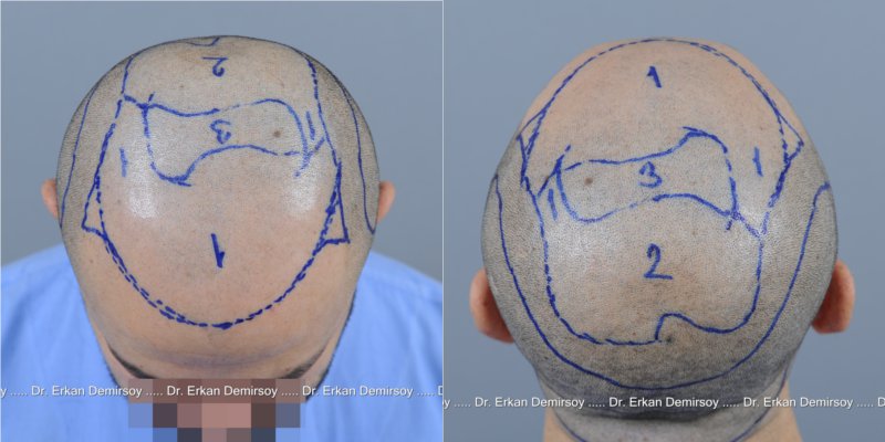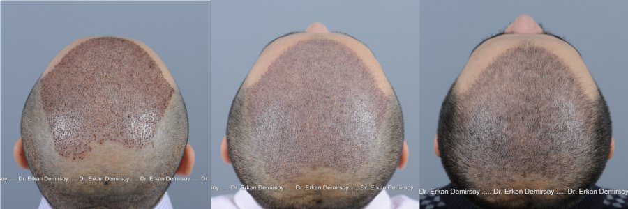 Alle Bilder, und vor allem die Vielzahl, sind so aussagekräftig, dass man gut erkennen kann, inwiefern sich das gesamte Erscheinungsbild des Patienten verändert hat und was mit nur 4570 Grafts auf so einer großen Fläche möglich ist.