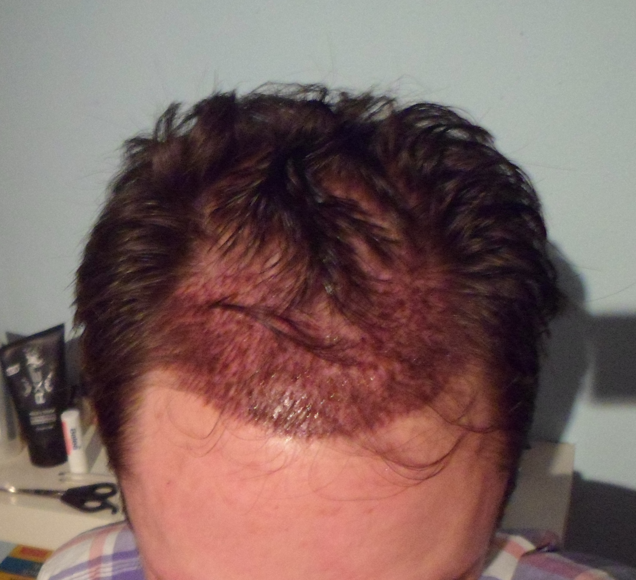 Jetzt mein bisher schlechtester Haarstatus, so hat es 3 Monate nach der HT ausgesehen. Da war ich selber schon wirklich skeptisch ob meine HT zu einem halbwegs guten Ergebnis führen wird vor allem weil mir gerade zu dieser Zeit hier auch so viel negatives über Moser berichtet wurde.