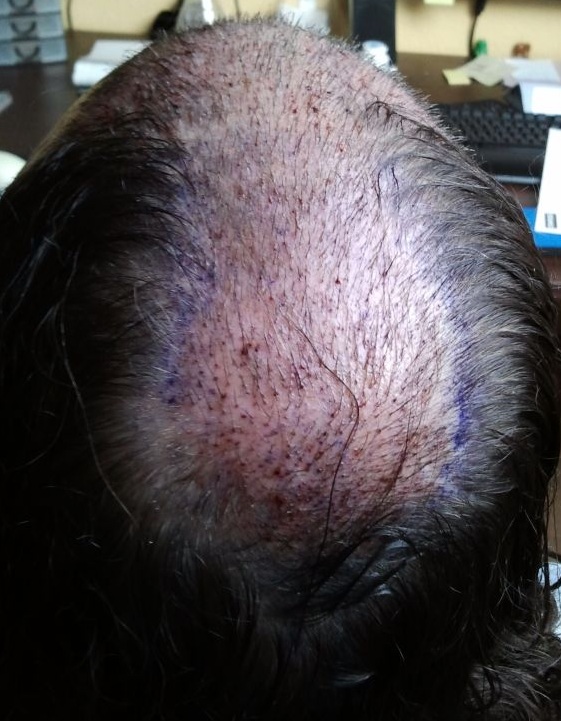Wir haben in dem Verlauf eine Sichtung meiner Donor-Zone, meiner generellen Haardichte und der Miniaturisierung gemacht. Ebenso wurde eine Haarlinie eingezeichnet, um ein mögliches Zielbild der HT zu bekommen. Diese Haarlinie haben wir besprochen und zusätzlich noch vermessen, um auf die umgefähre Anzahl der Transplantate zu kommen: 4500.