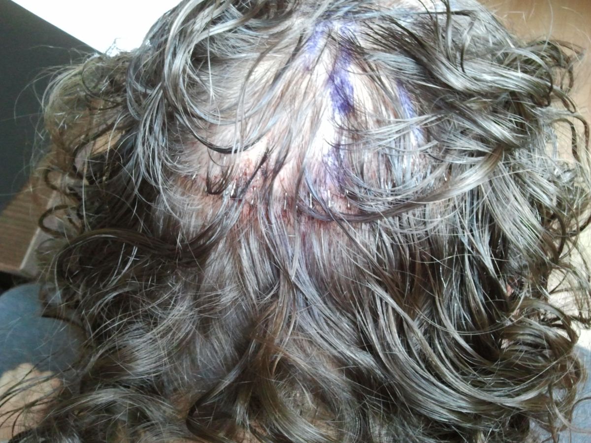 - Die Stellen entlang der Narbe und an den Klammernenden wachsen zu, d.h. die ge-shockloss-ten Haare sind im Kommen