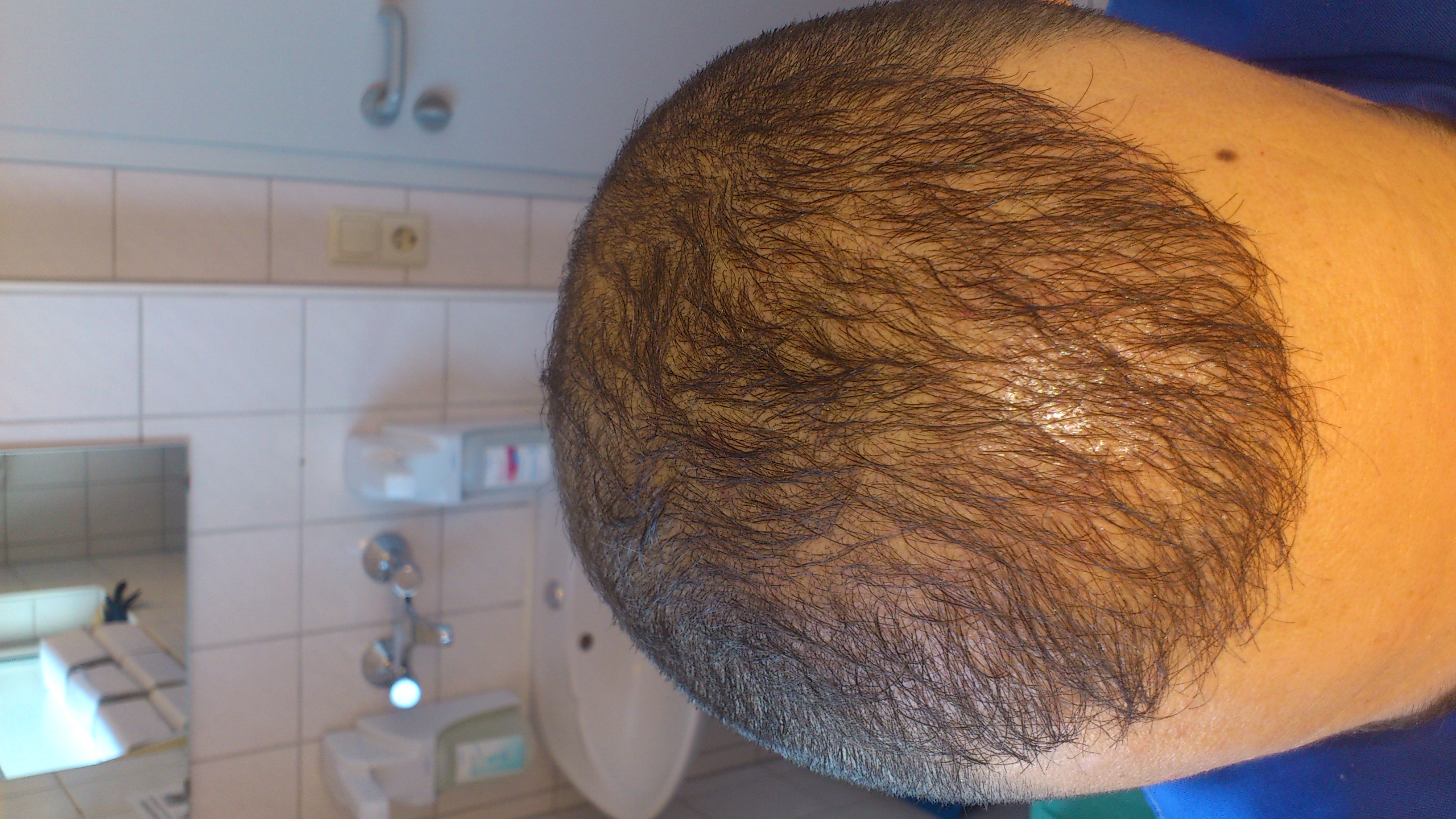 Ich finde für ein Zwischenergebniss sieht das schon ganz gut aus, die transplantierten Haare sind schon wesentlich dicker und Dichter geworden.