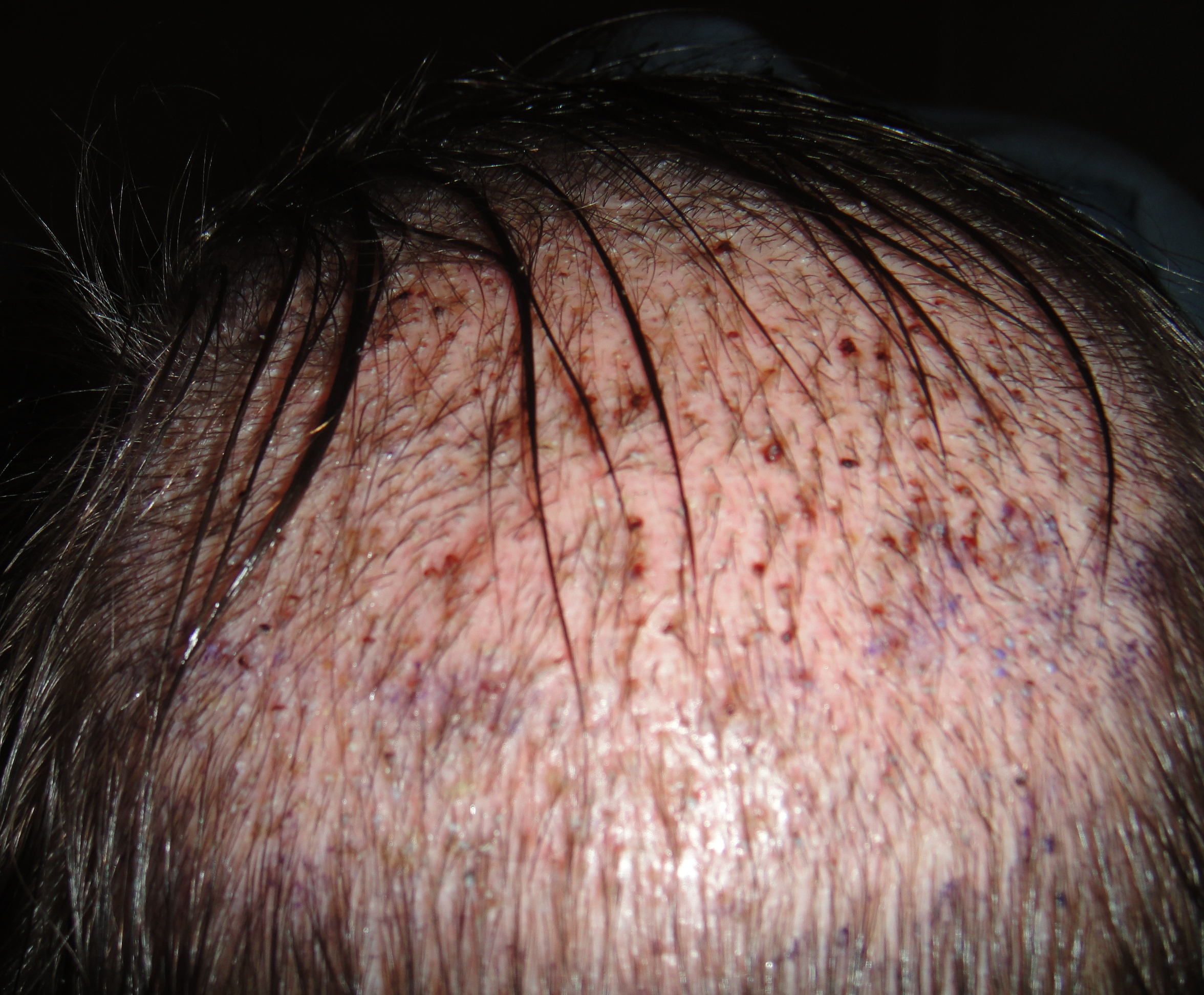 Hier Bilder zwei Wochen nach der OP. Insbesondere vorn hatte ich mit hartnäckigen Krusten zu kämpfen. Nach 3 Tagen mit Einweichen in der Badewanne waren diese aber auch weg. Ich schätze, dass noch ca. 70% der Transplantate übrig sind.