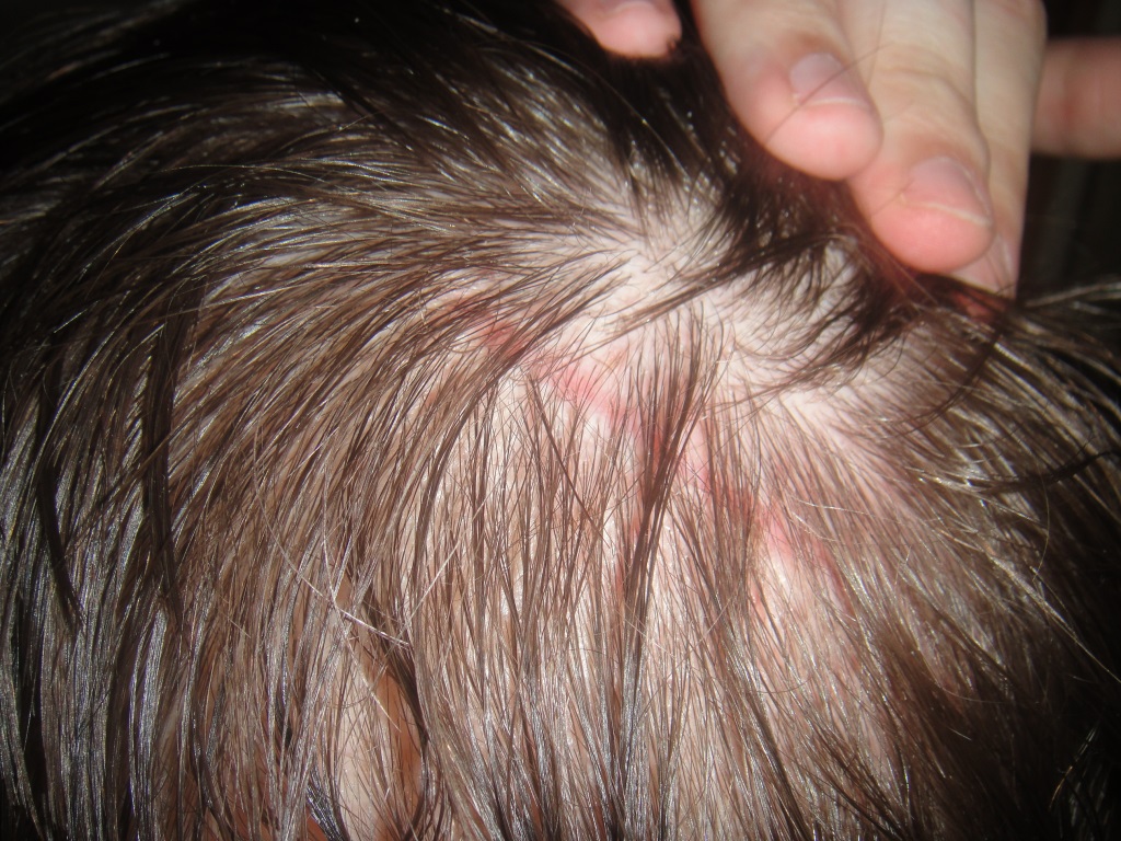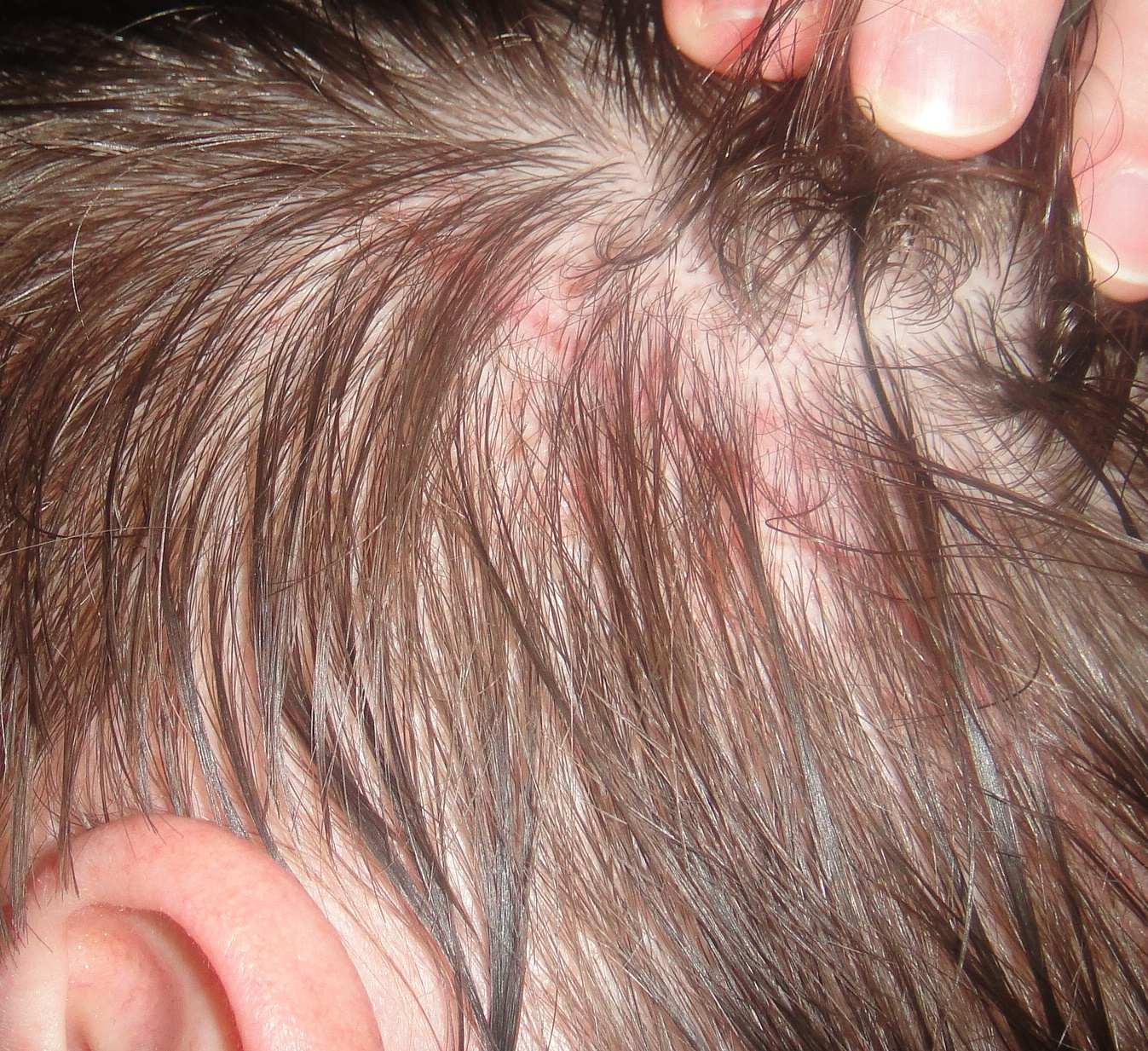 Im Bereich des Shock-Loss auf der rechten Seite beginnen die Haare wieder zu wachsen. Ich sehe es optisch und habe auch öfters Pickel auf bzw. um die Narbe, wie auch auf den Bildern zu sehen ist. Des Weiteren habe ich für mich eine Möglichkeit gefunden die Breite der Narbe abschätzen zu können. Auf dem Bild seht ihr einen Papierschnipsel 10x5mm, so dass ich den geröteten Bereich, in welchem aber auch Haare sind, auf ca. 4mm schätze und die Narbe auf ca. 2mm.
