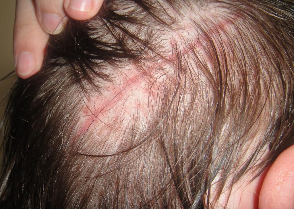 Im Empfängergebiet habe ich jeden Tag 5-10 große Hautschuppen, die nach dem Haarewaschen im Haar hängen oder die ich beim über die Hautstreichen abbekomme. Bei einigen im vorderen Bereich habe ich gesehen, dass beim wegstreichen unpikmentierte Haare zum Vorschein kommen. Dazu habe ich immer mal wieder ein paar Pickel (4-8 in der Woche).