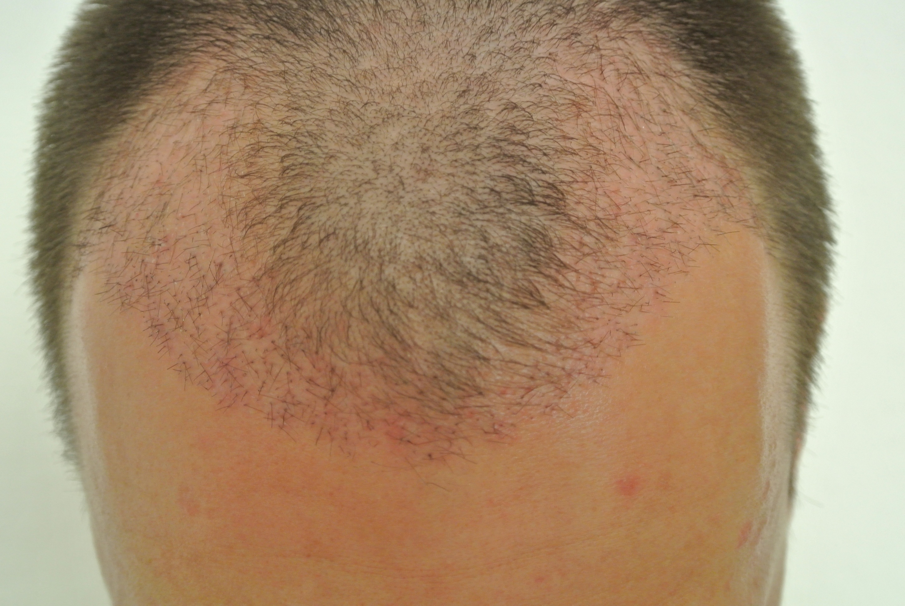 Die ersten Haare kommen wieder durch. Sie sind allerdings noch sehr fein und lassen sich nur schwer von der Kamera erfassen. Grundsätzlich bin ich mit der Entwicklung aber gut zufrieden. Nachdem die Haare zunächst drei Wochen nach der HT ausgefallen waren, war der Fortschritt seitdem erwartet langsam. In den letzten drei Wochen ging es dann wirklich los. Ich hatte in der Zwischenzeit etwa 2 kleine Pickelchen, wo sich die neuen Wurzeln entzündet haben. Alles in allem aber harmlos.