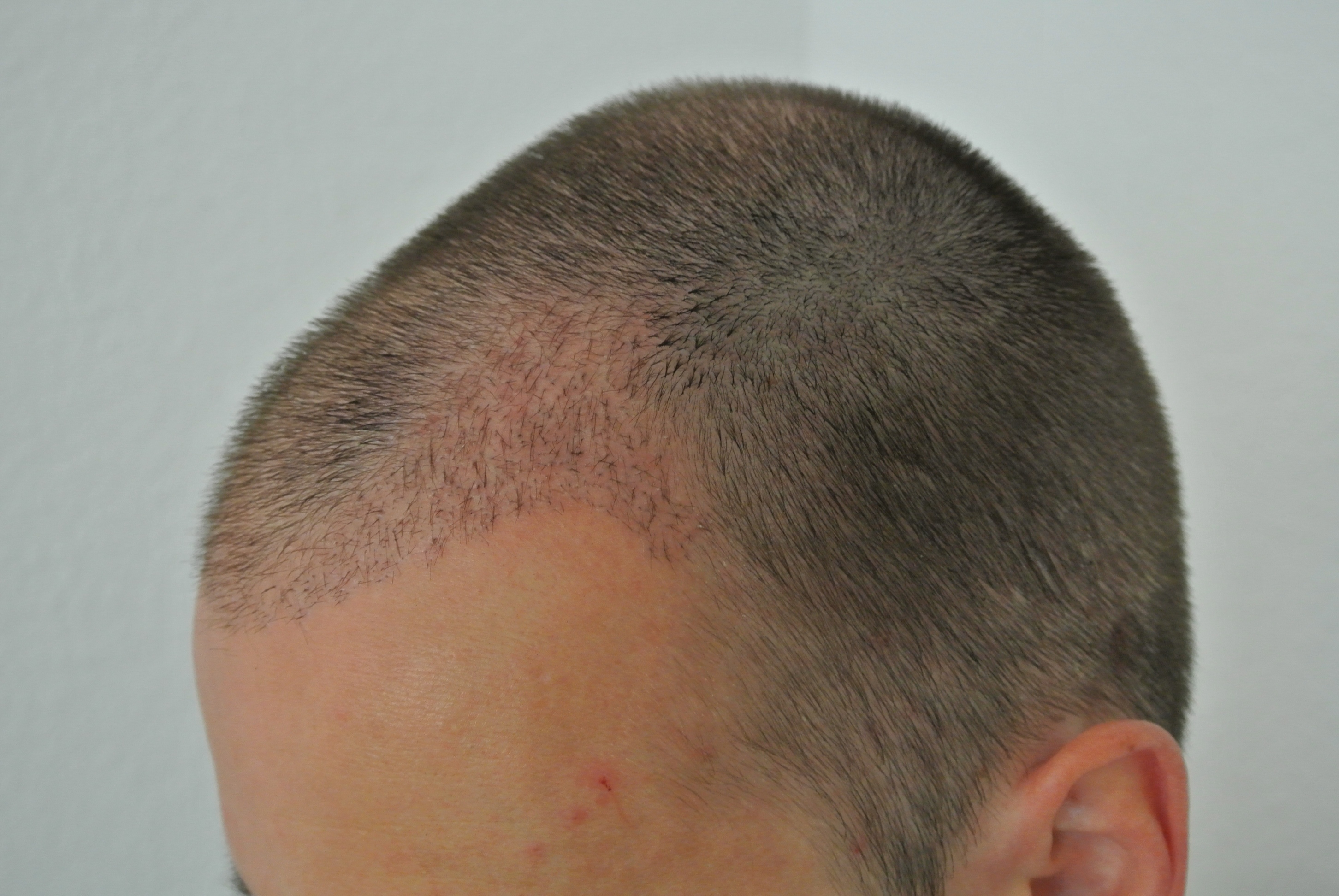 Die ersten Haare kommen wieder durch. Sie sind allerdings noch sehr fein und lassen sich nur schwer von der Kamera erfassen. Grundsätzlich bin ich mit der Entwicklung aber gut zufrieden. Nachdem die Haare zunächst drei Wochen nach der HT ausgefallen waren, war der Fortschritt seitdem erwartet langsam. In den letzten drei Wochen ging es dann wirklich los. Ich hatte in der Zwischenzeit etwa 2 kleine Pickelchen, wo sich die neuen Wurzeln entzündet haben. Alles in allem aber harmlos.