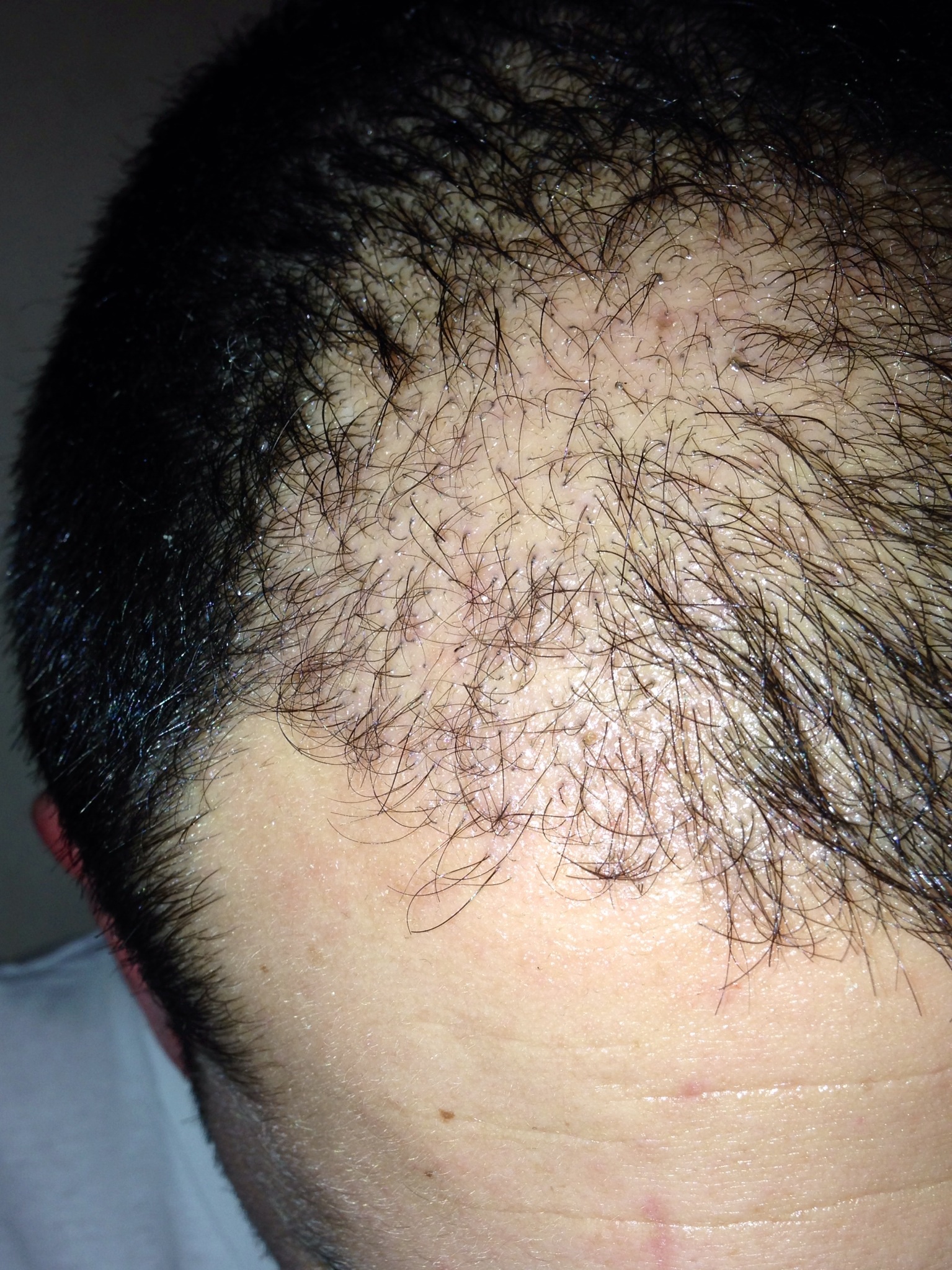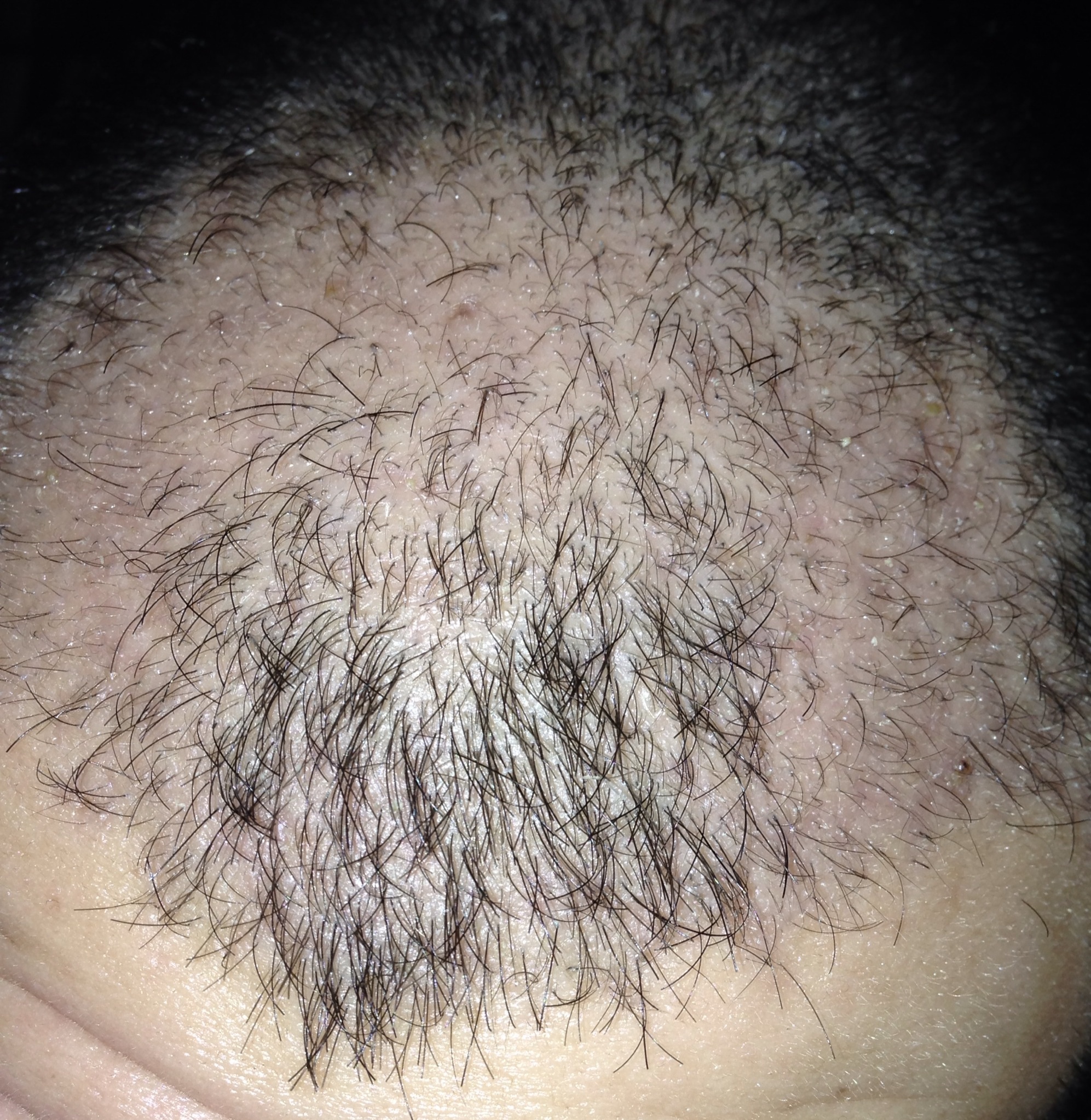 Hier ein Bild wo man es gut erkennen kann, die Haare in der Mitte bzw. Die längeren sind nicht transplantierte Haare.