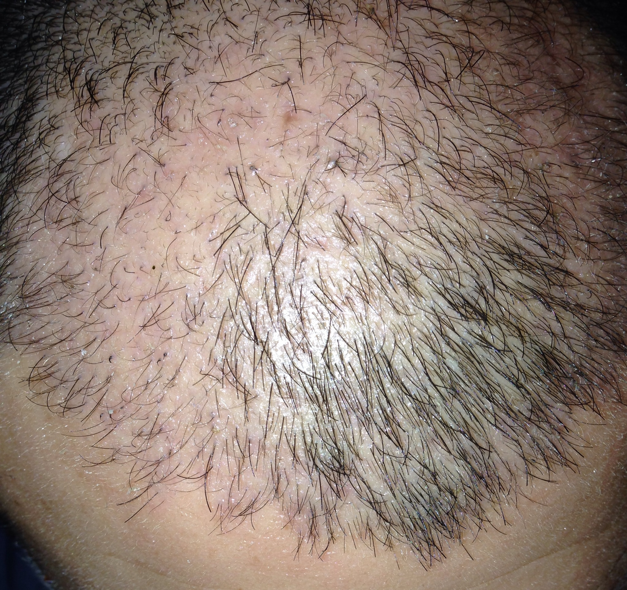 Hier ein Bild wo man es gut erkennen kann, die Haare in der Mitte bzw. Die längeren sind nicht transplantierte Haare.