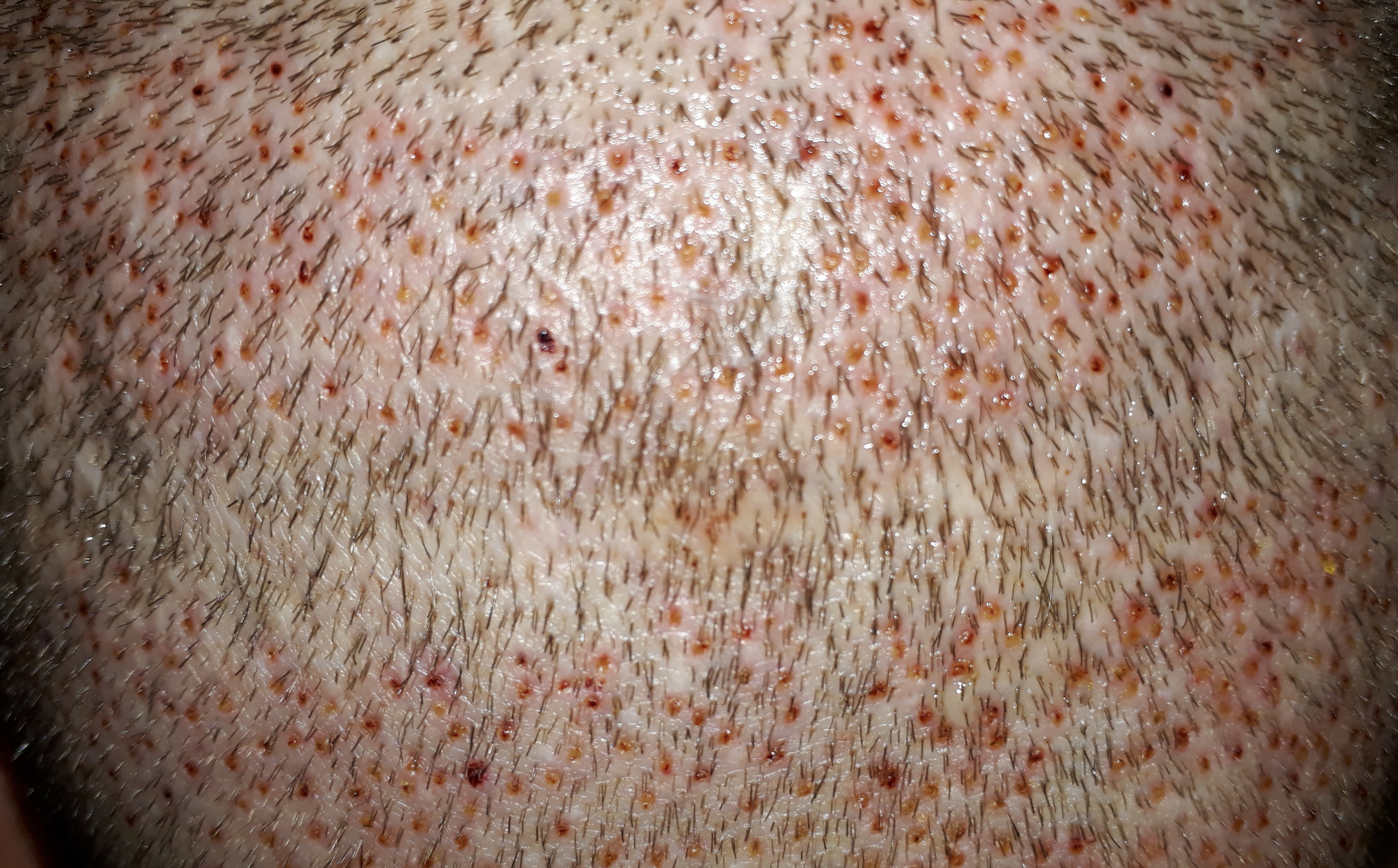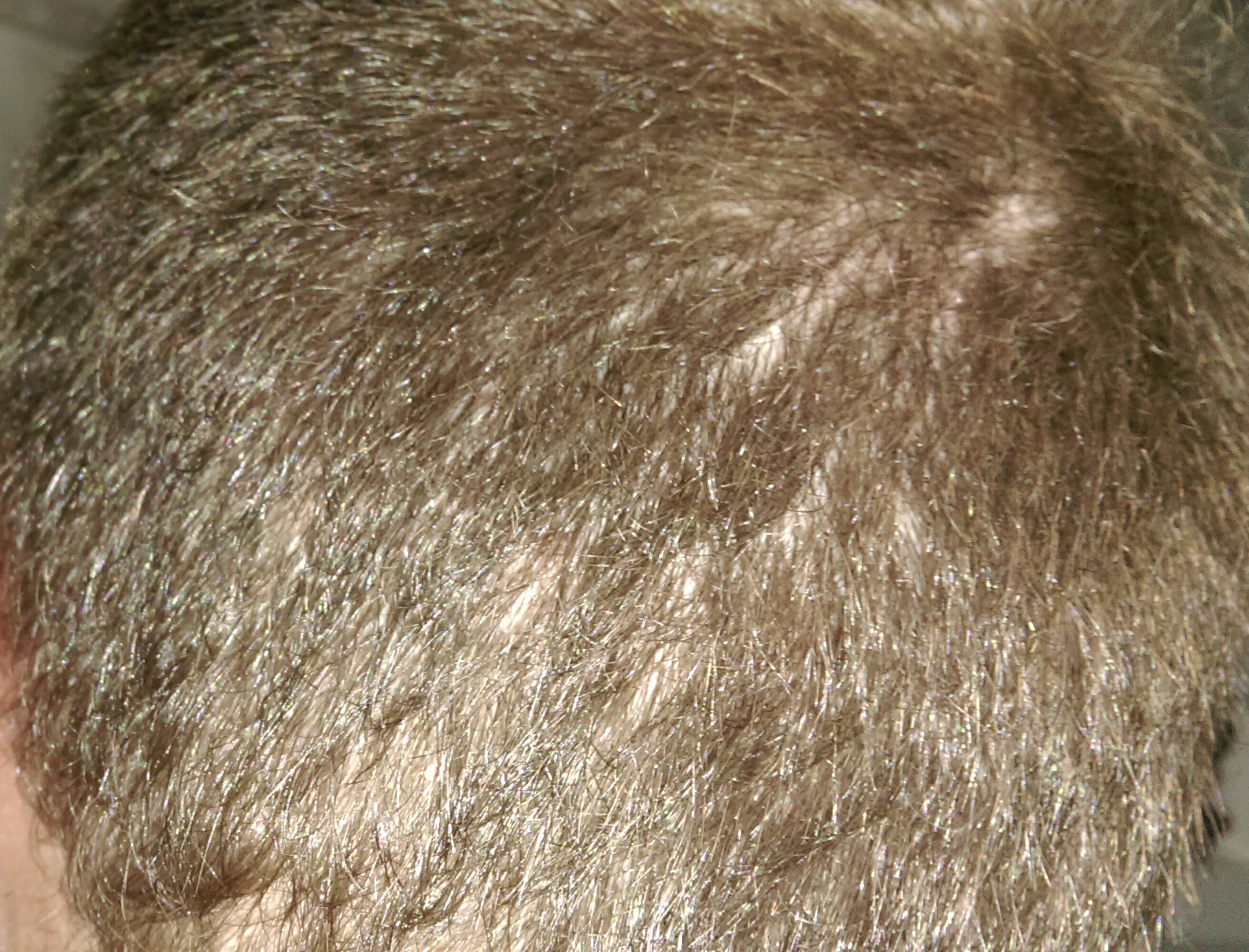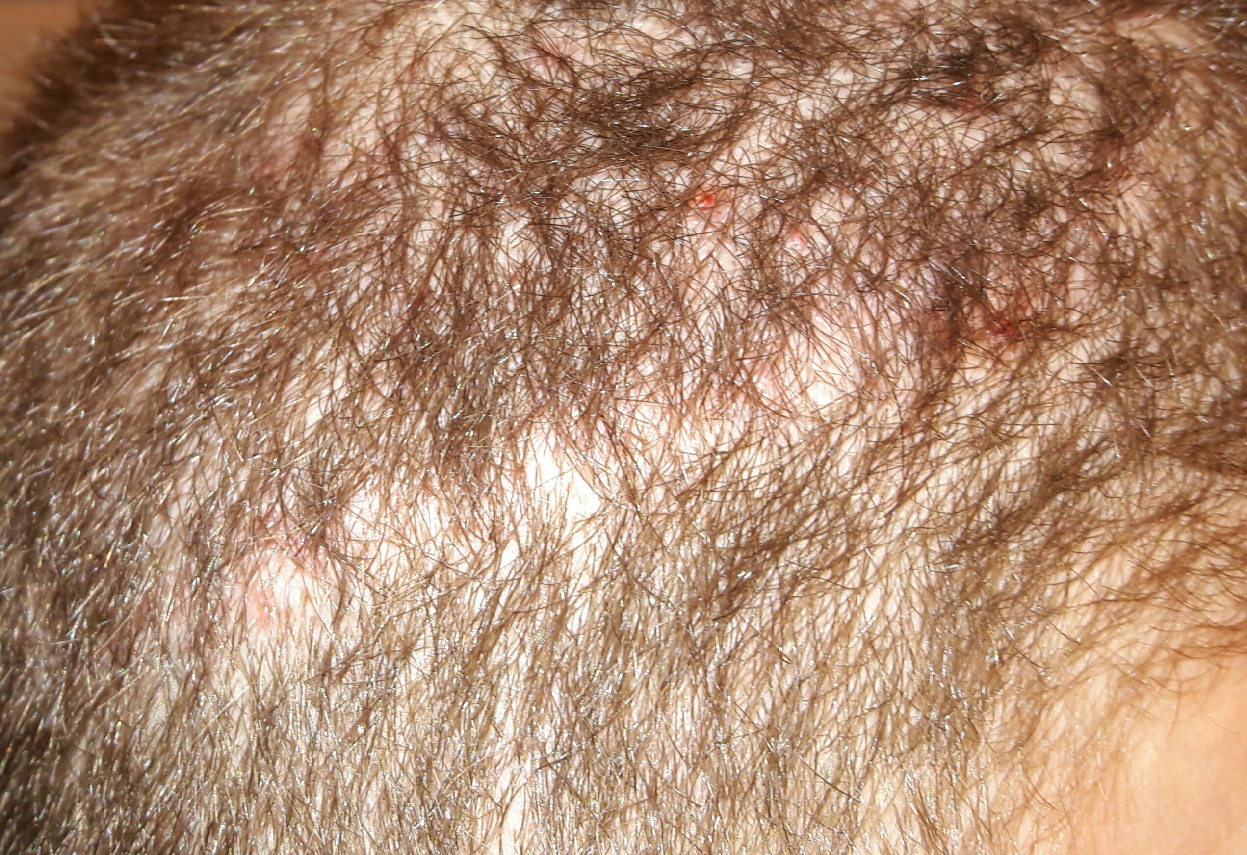 Haare wurden vorgestern auf 6 mm rasiert und Blitz wurde verwendet - also denkbar ungünstige Verhältnisse um etwas zu verbergen.