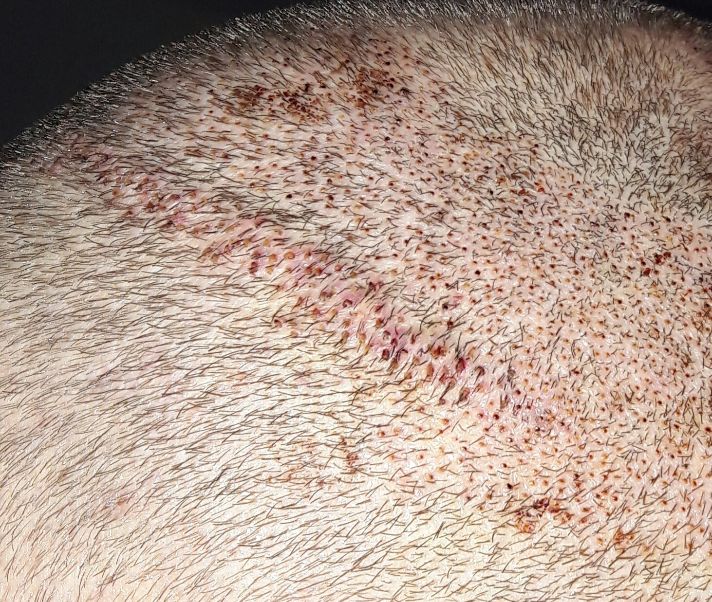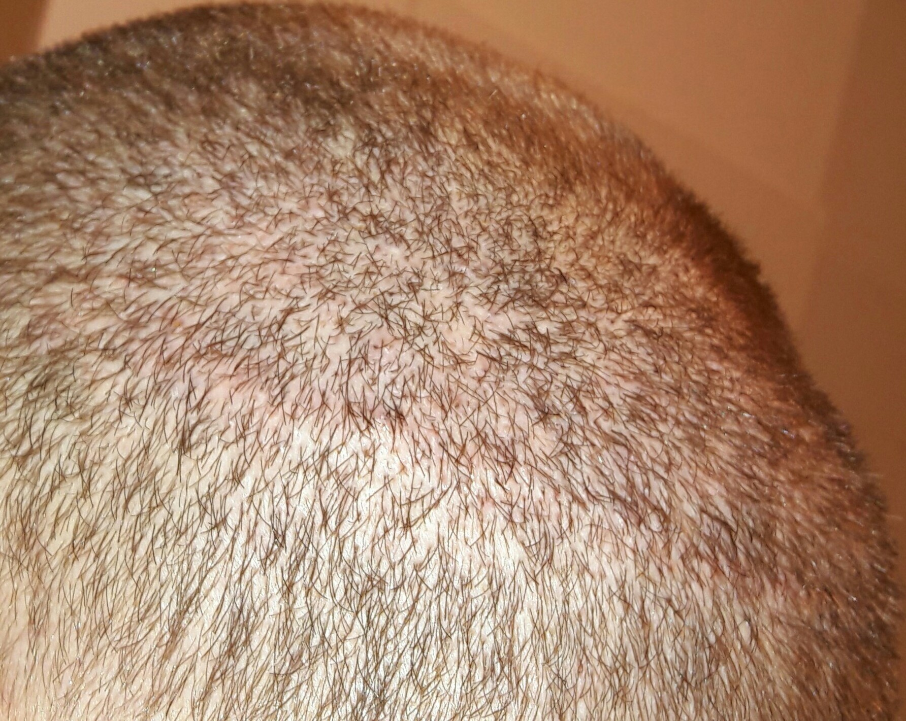Bin mit dem Narbenergebnis sehr zufrieden und werde lediglich nochmal oberhalb der Narbenkante (Grafts sitzen hier sehr eng) einige entnehmen lassen.