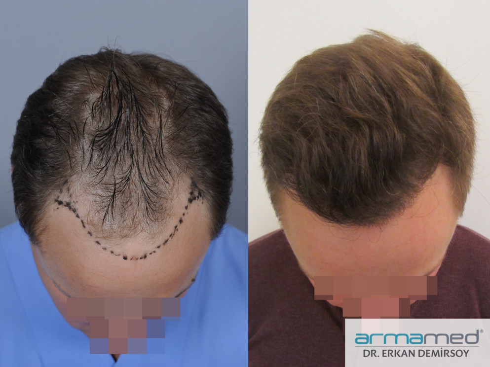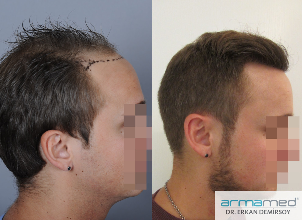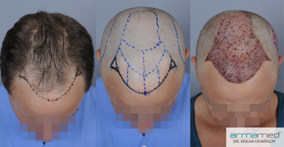 Bei dem obigen Patienten wurde der vordere Bereich mit manuell entnommen Grafts behandelt und der kleine Bereich dahinter mit motorisiert entnommen Grafts.
