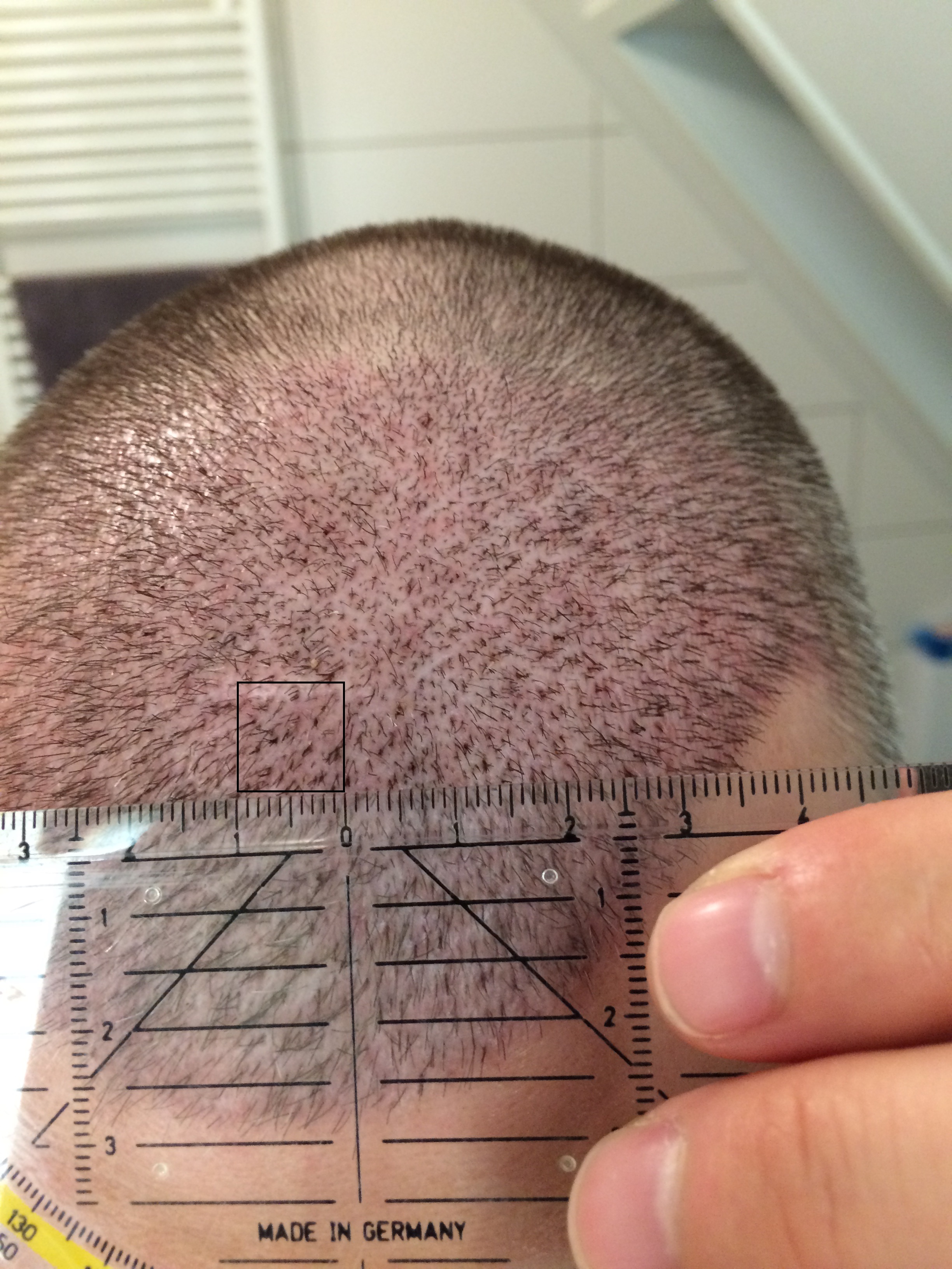 Die genaue Fläche haben wir jetzt nicht berechnet. Aber wir haben gesagt, dass 3000 Grafts versetzt werden müssen um eine gute Dichte zu erreichen.