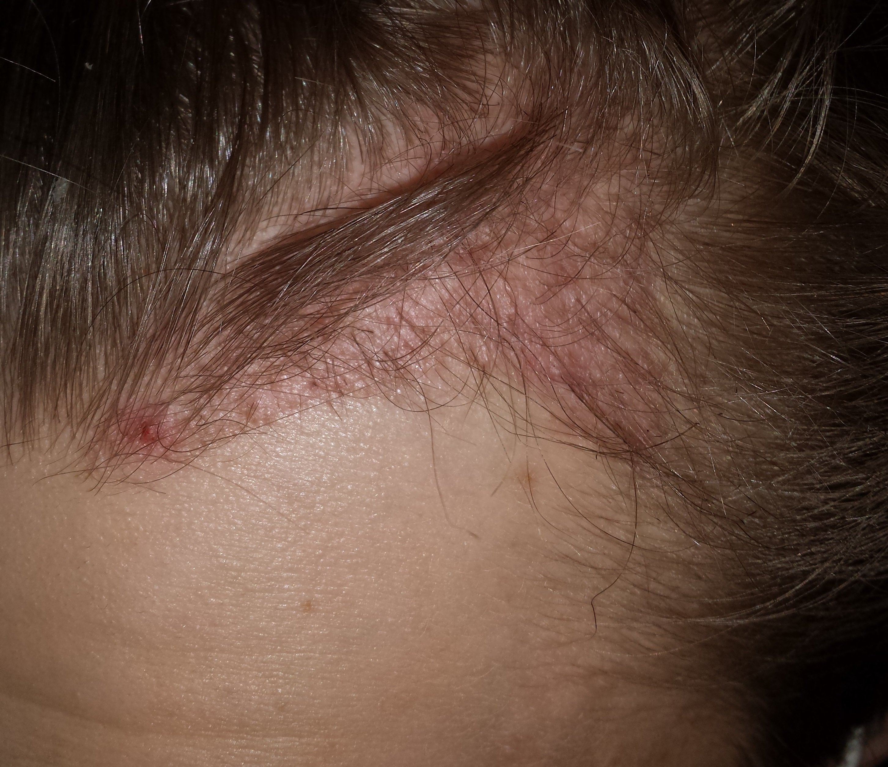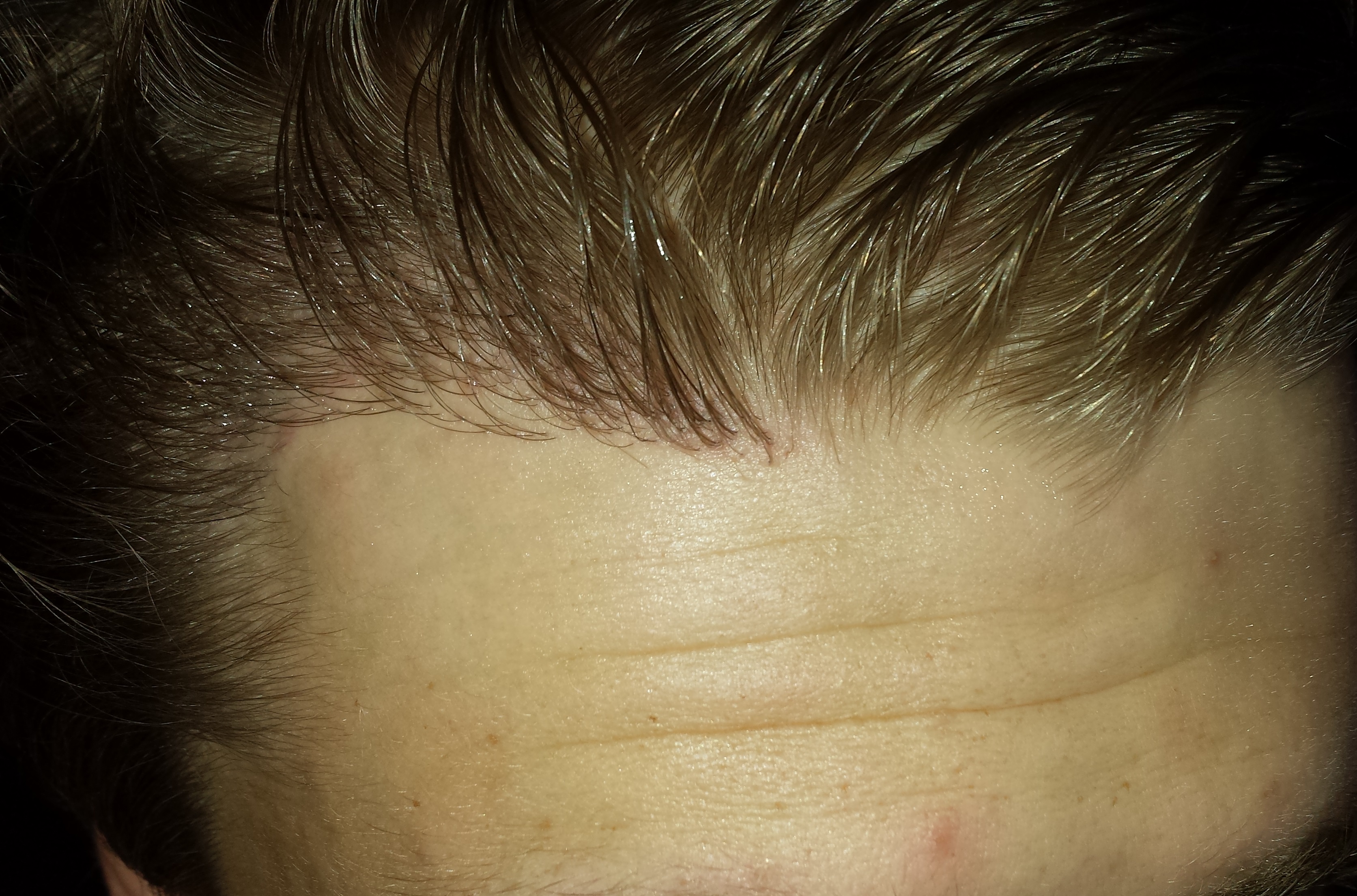 Man kann auch schon einige dünne Härchen erkennen die im transplantierten Bereich wachsen. Das sind denke ich die Haare, die nicht wieder ausgefallen, sondern direkt angewachsen sind. Die dichter wirkenden Haare an den Seiten des Gebietes (besonders bei der linken GHE) sind die nur OP wegrasierten Haare, in die auch hineintransplantiert worden ist, da sich das Haar an der Stelle auch schon ausgedünnt hat. Diese wachsen jetzt gerade normal nach.