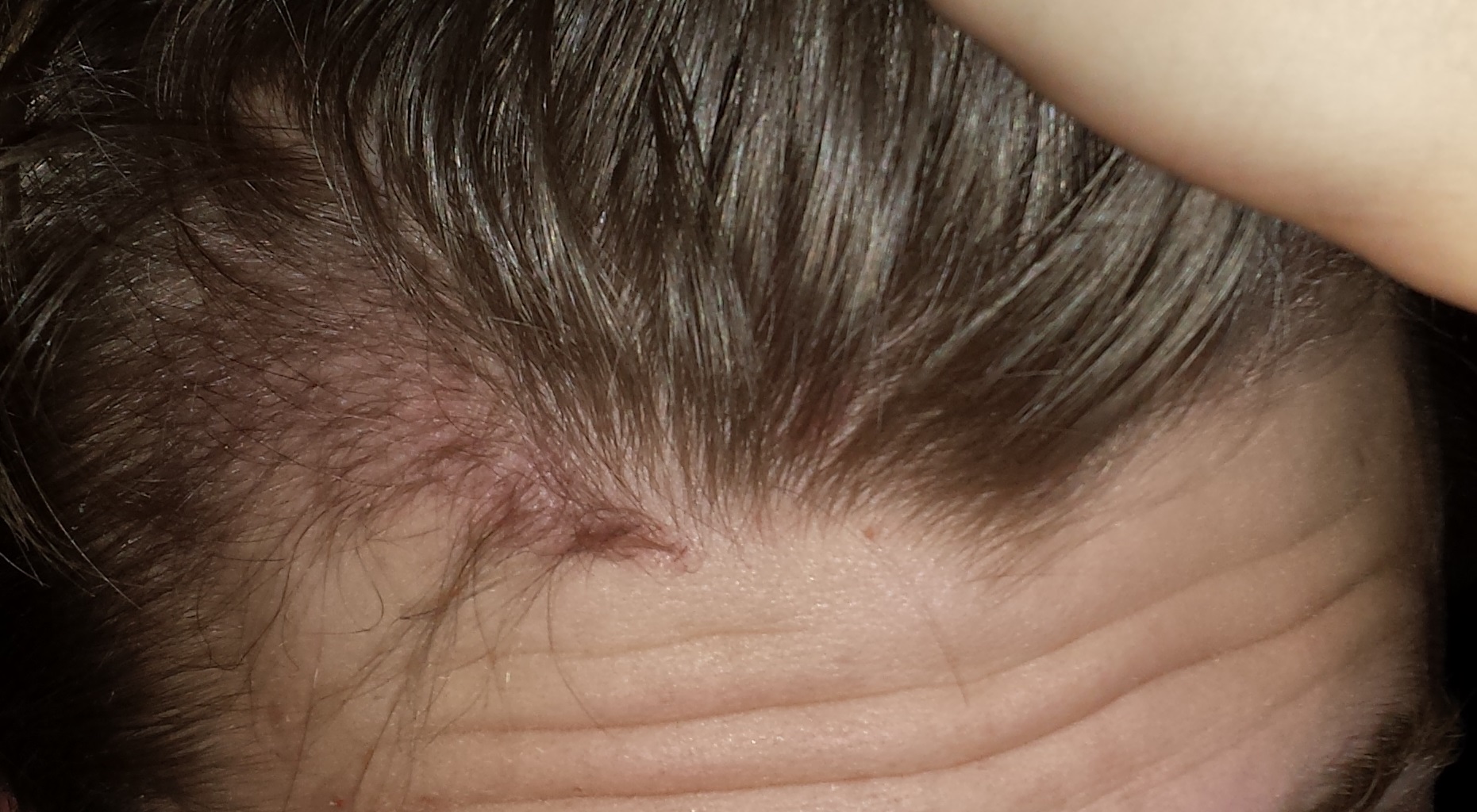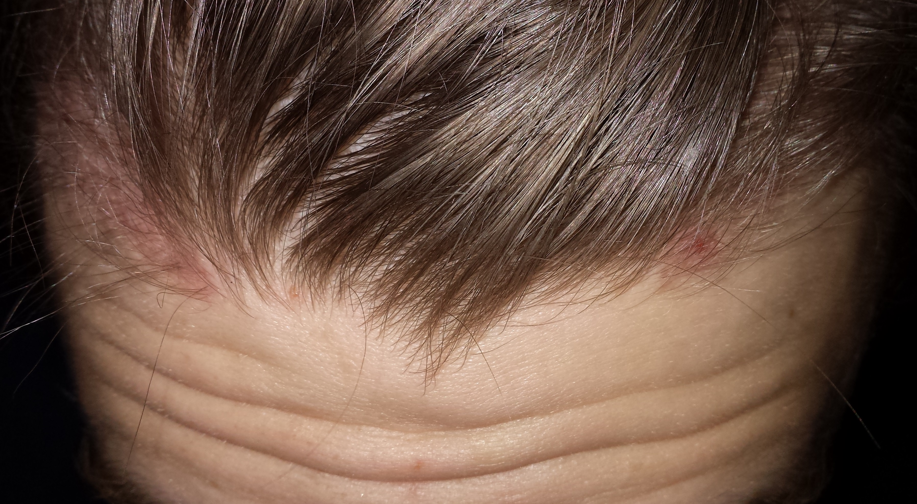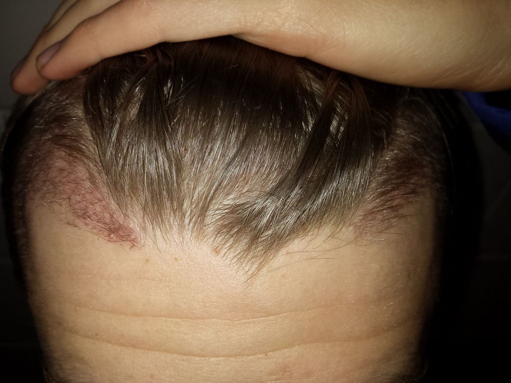 Man kann auch schon einige dünne Härchen erkennen die im transplantierten Bereich wachsen. Das sind denke ich die Haare, die nicht wieder ausgefallen, sondern direkt angewachsen sind. Die dichter wirkenden Haare an den Seiten des Gebietes (besonders bei der linken GHE) sind die nur OP wegrasierten Haare, in die auch hineintransplantiert worden ist, da sich das Haar an der Stelle auch schon ausgedünnt hat. Diese wachsen jetzt gerade normal nach.