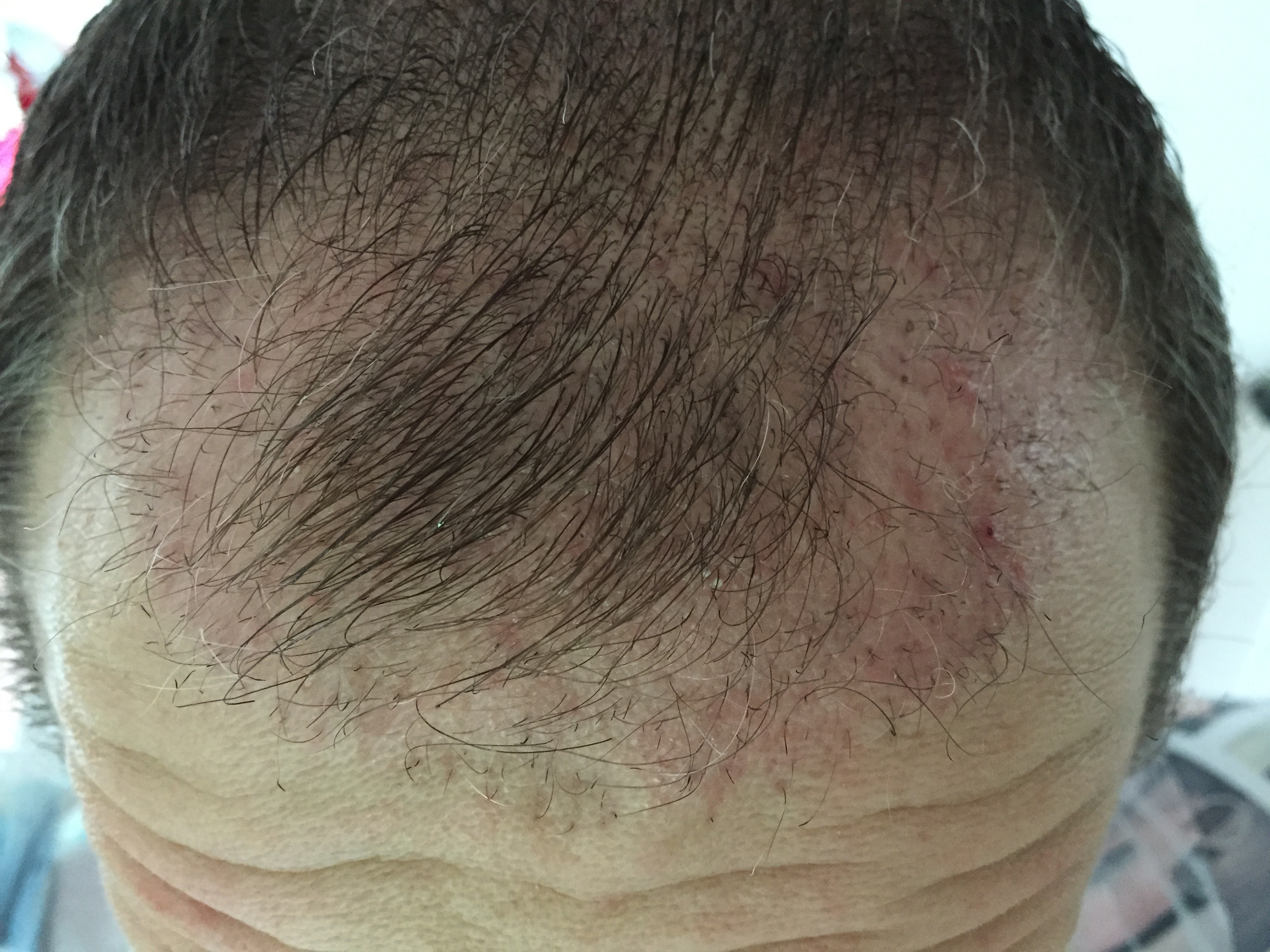 Bisher wenig Haare verloren aber im Vergleich zu den Seiten wachsen sie schon langsamer bzw. noch nicht dicht, so, dass man noch die Kopfhaut deutlich sieht. Krusten sind so gut wie alle ab, so dass es bisher niemand bemerkt hat.