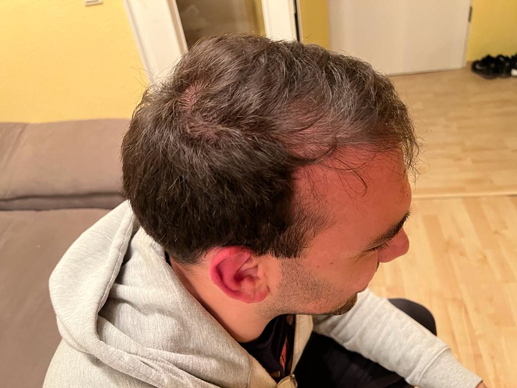 Das war die Ausganssituation nach dieser Zeit. Ich habe bereits ca. 2020/21 gemerkt, dass es etwas lichter wird und sich das "originale" Haare weiter zurück zieht. Mittlerweile auch leicht am Hinterkopf. Das hatte mir 2014 schon Dr. Finner (Praxis am Wittenbergplatz, Berlin) prophezeit und leider ist es eingetreten.