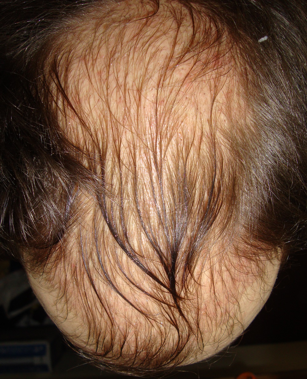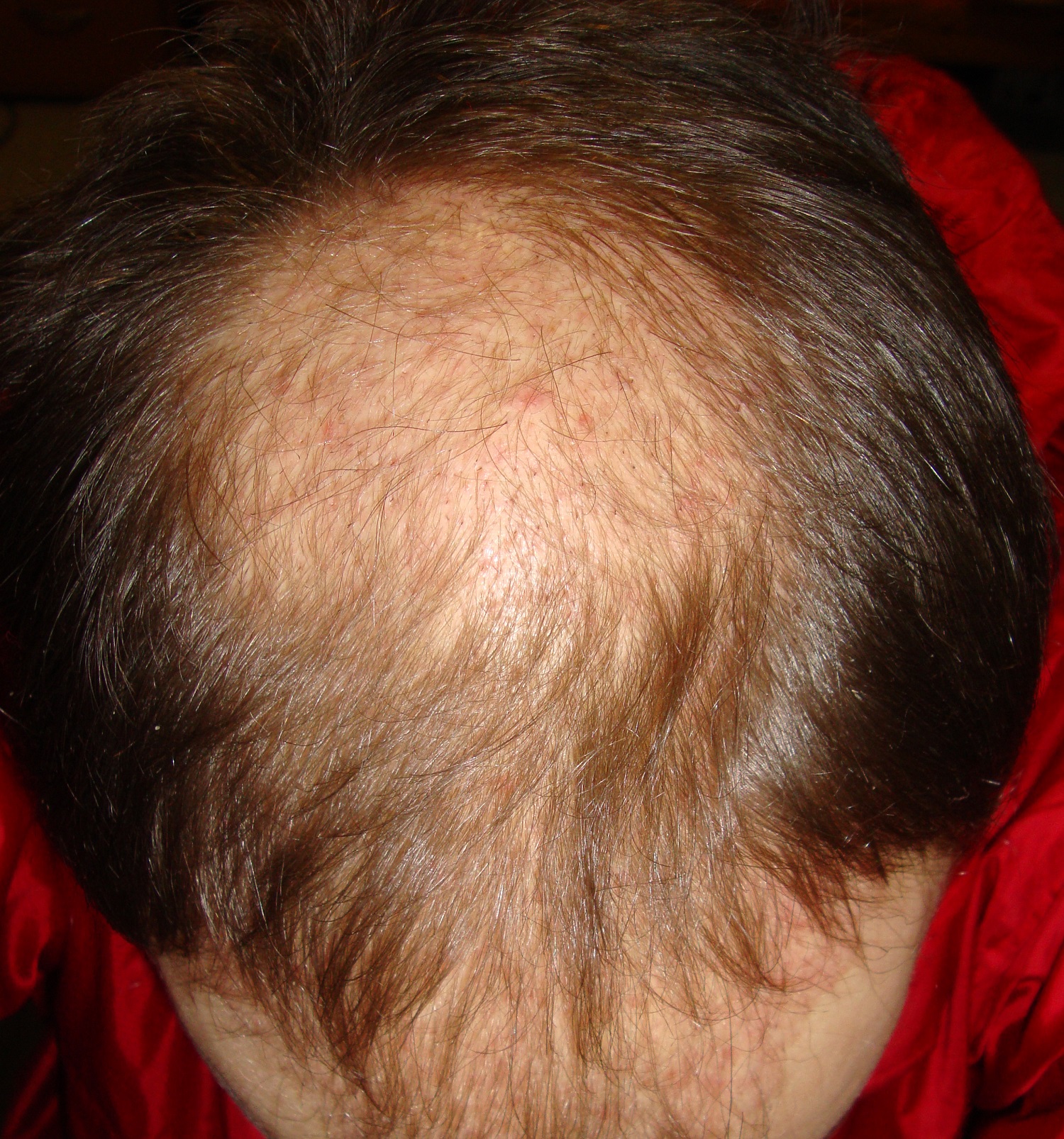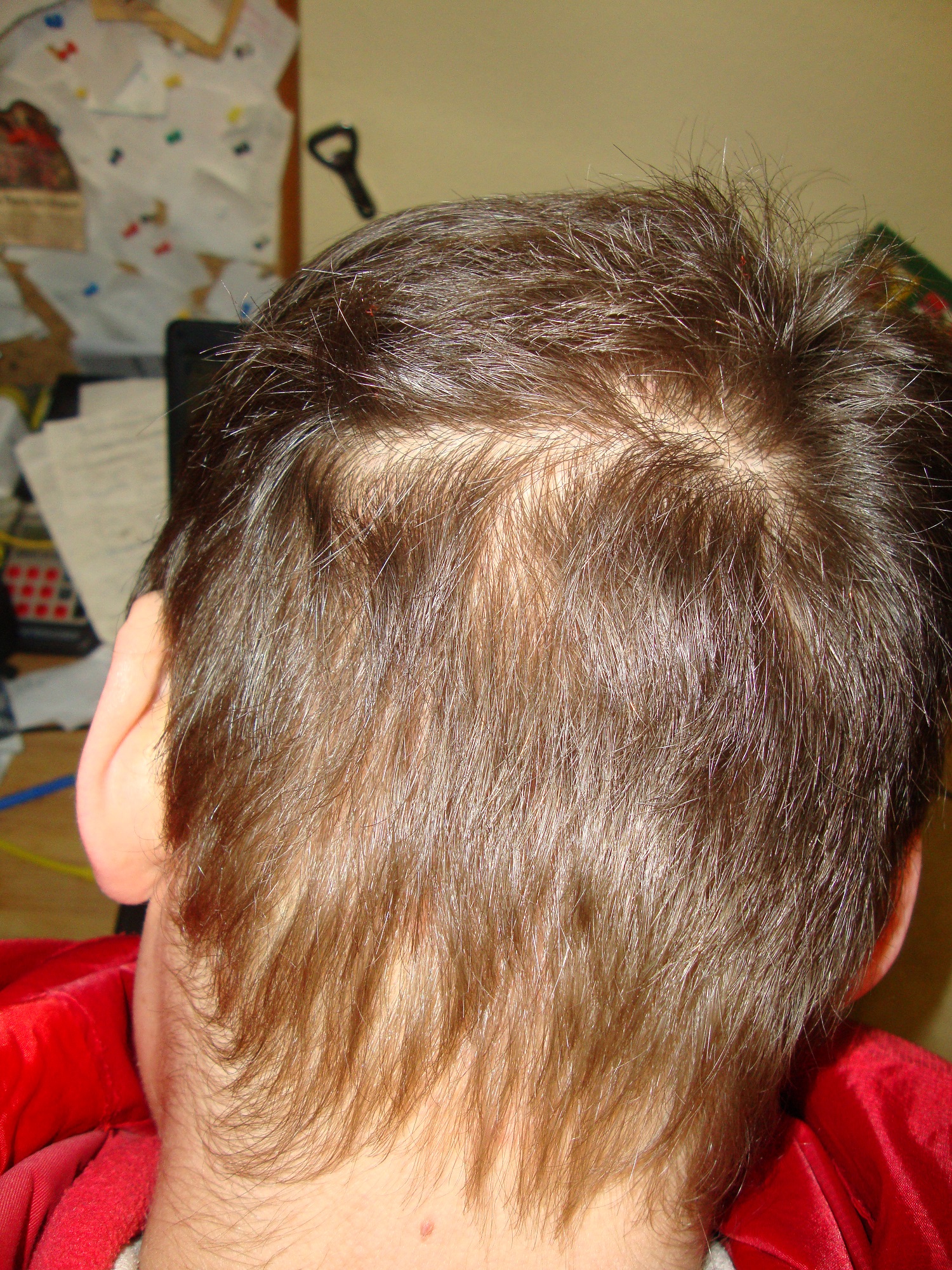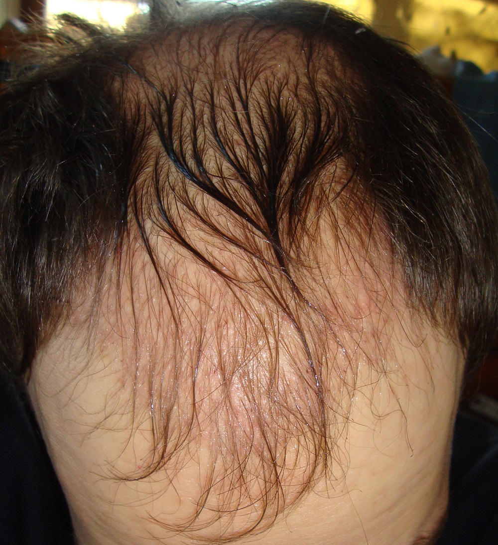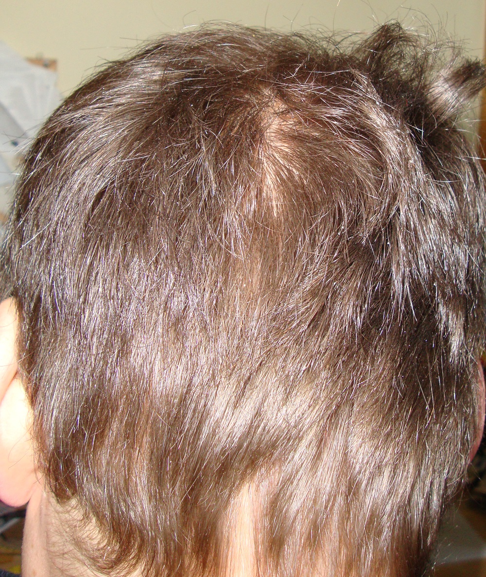 Habe vom Oberkopf mal die genau gleiche Position ausgeschnitten - einmal von 2012 (rechte Seite), einmal von gerade eben (2015, linke Seite). Man sieht ein paar dickere, längere Haare und überall zwischen den miniaturisierten Vellushaaren ein paar dickere Terminalhaarstummel. Wenn das noch mehr werden, sollte das Ergebnis optisch besser werden und ich habe eine kleinere Helikopterlandefläche als 2012. Vorne schaut es noch besser aus, allerdings bringen das die Bilder kaum rüber, weil die Haare fast durchsichtig sind. Habe mehrere Bilder gemacht, aber ich denke, dass es für die Foristen nicht nachvollziehbar ist, deswegen habe ich dieses Mal darauf verzichtet, das Bild von der Stirn zu zeigen. Erst wenn die Fortschritte auch auf den Bildern klar erkennbar sind, poste ich diese wieder. Zuletzt noch ein Bild vom Donor, der nun wieder ausschaut wie vorher, allerdings spüre ich den geringeren Haarabstand, wenn ich mit der kalten Hand hinten hin lange. Dort, wo nicht entnommen wurde, spüre ich die Kälte auf der Kopfhaut weniger als da, wo Haare fehlen. Nun gut, solange man es optisch nicht so sieht, soll mir das egal sein, überhaupt habe ich aktuell keine großen Erwartungen mehr und vermeide es, mich über die kleinen Erfolge zu freuen, wenn ich sehe, wie andere hier so nach fast einem halben Jahr nach der HT ausschauen.