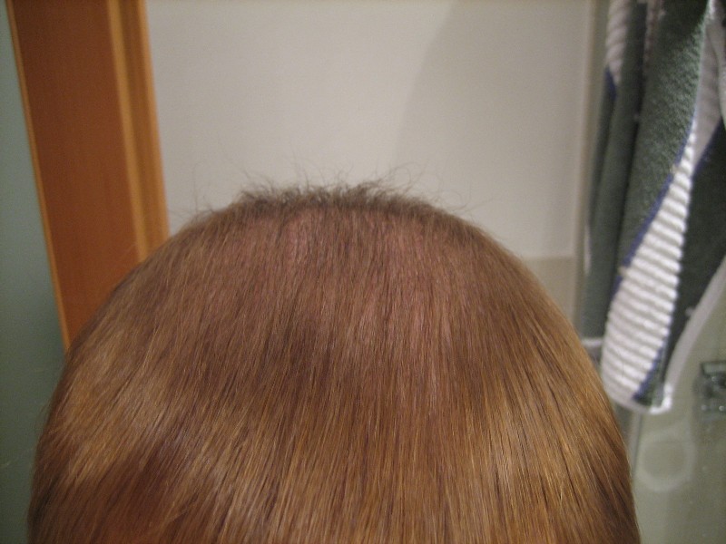 Wenn die bisherigen Haare noch etwas länger werden, wird es sicher noch ein bisschen besser decken. Auch der Übergang (am Wirbel) zwischen "alt" und "neu" müsste von meiner begeisterten Friseuse demnächst angeglichen werden, da die derzeit viel längeren Haare unfrisiert diese Fläche natürlich schwerkraftbedingt freilegen...