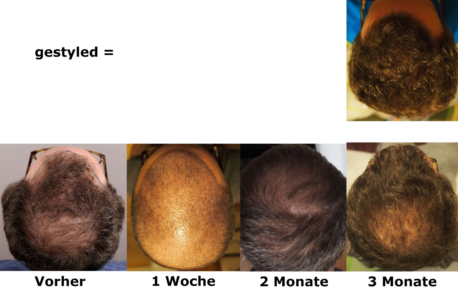 Haha ja ich gebe dir eigentlich recht... verrückterweise, denn wie man auf den vorher-Bildern sehen kann, ist der Haarstatus oben äußerst bescheiden... vielleicht kommt das von noch viel vorhandenen Mikrohaaren, die allesamt kurz vorm absterben sind und eben auf der Glatze sichtbar sind, nicht aber als "richtige dicke Haare" bei längeren Frisuren.